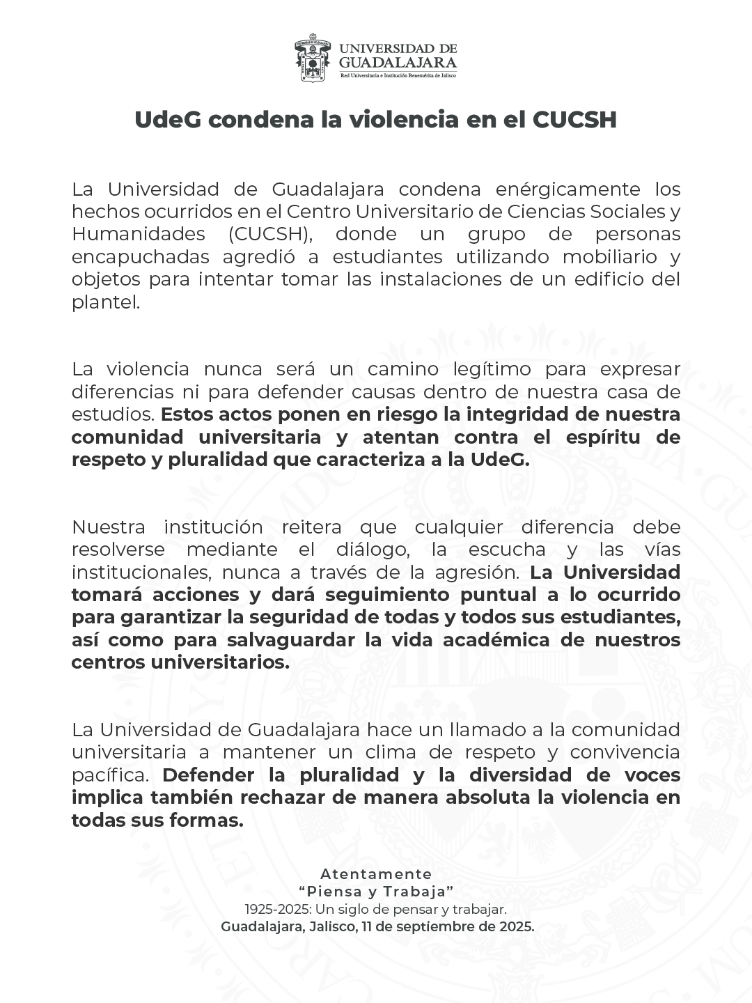 Por su parte, la rectora del CUCSH, Dulce María Zúñiga Chávez, emitió un video donde también denunció la manera en que estas personas encapuchadas entraron no sólo para agredir a estudiantes, sino también a personal administrativo y docente del CUCSH. En su comunicado público de poco más de un minuto aclaró que mantendrán el diálogo con las y los estudiantes que aún mantienen el paro: “aquí decimos con claridad: sí al diálogo, no a la violencia. Nuestra dignidad universitaria no se rompe con golpes ni se apaga con extintores”.