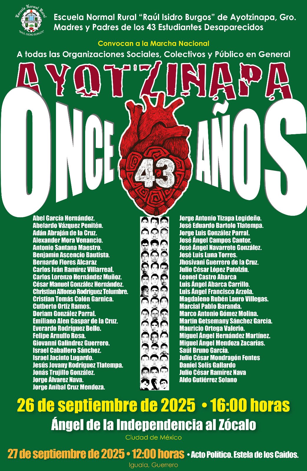 A pocos días de cumplirse 11 años de la desaparición forzada de los 43 normalistas de Ayotzinapa, sus madres y padres, así como estudiantes de la Normal Rural “Raúl Isidro Burgos”, continuarán exigiendo justicia y convocan a la marcha número 132, este 26 de septiembre, que partirá del Ángel de la Independencia, con destino al Zócalo de la Ciudad.