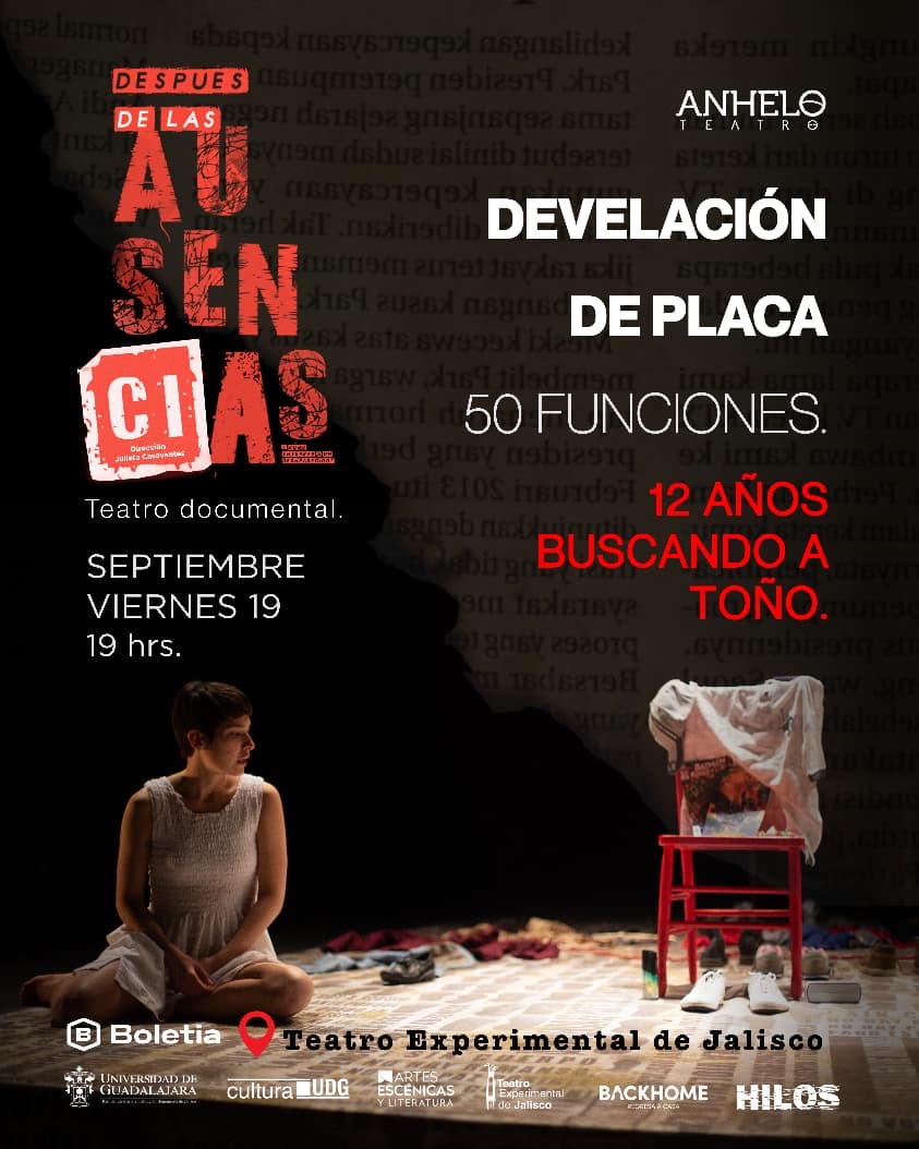 La obra documental “Después de las ausencias” reconstruye la desaparición de Antonio Reynoso Hernández cometida, en 2013, por policías estatales en San Pedro Tlaquepaque, Jalisco. El montaje utiliza elementos reales, tales como fichas de búsqueda que son colocadas en las butacas para representar a las más de 16 mil personas que han sido desaparecidas en Jalisco, pero también emplea entrevistas con madres buscadoras, activistas y periodistas para conectar la puesta en escena con la crisis de desaparición que se vive en el estado.