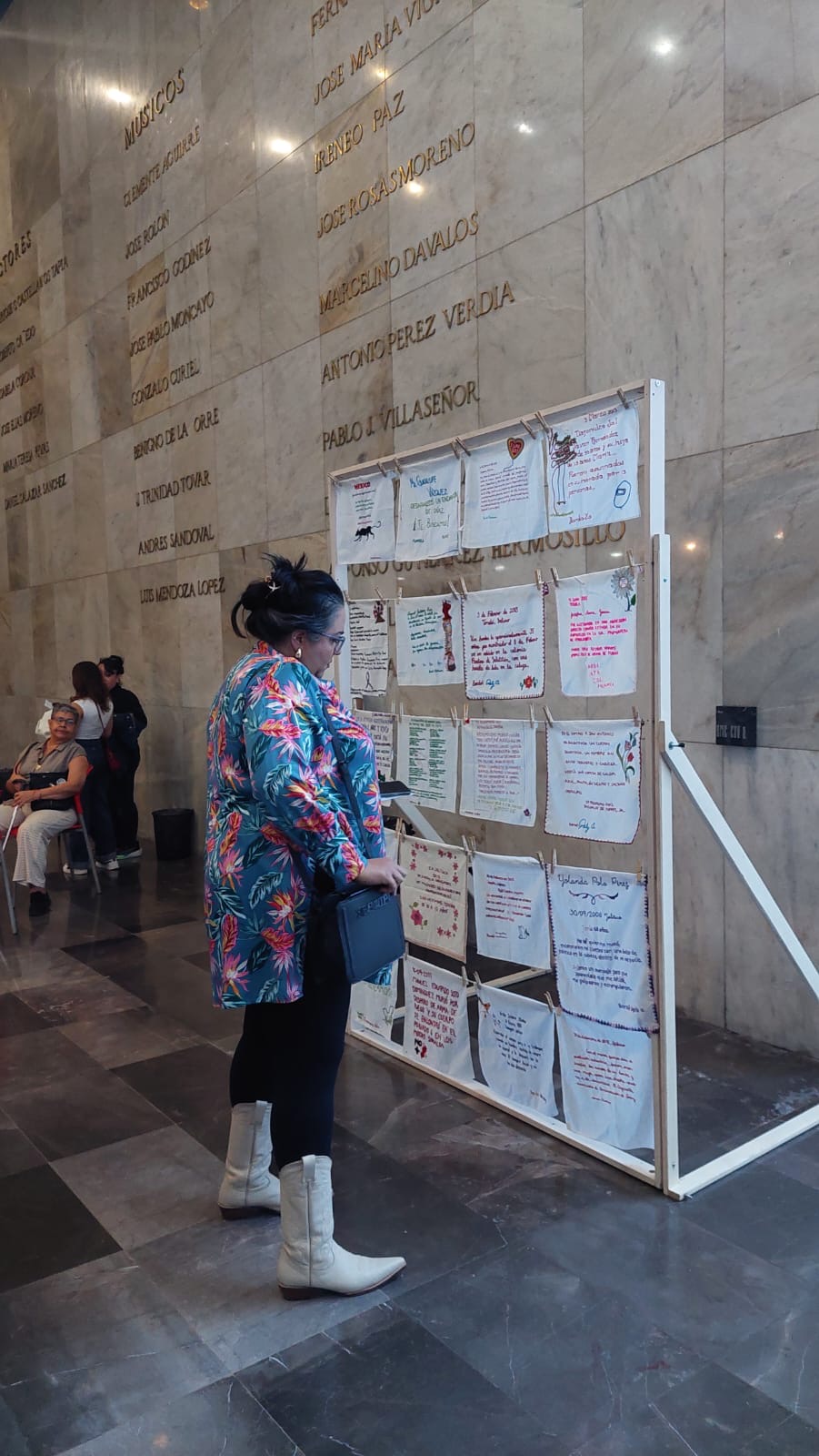 En el vestíbulo del teatro se exhiben pañuelos tejidos a mano que contienen datos y nombres relacionados con la crisis de desapariciones en México y Jalisco. Estos pañuelos forman parte del proyecto de memoria conocido como Bordando por la paz.