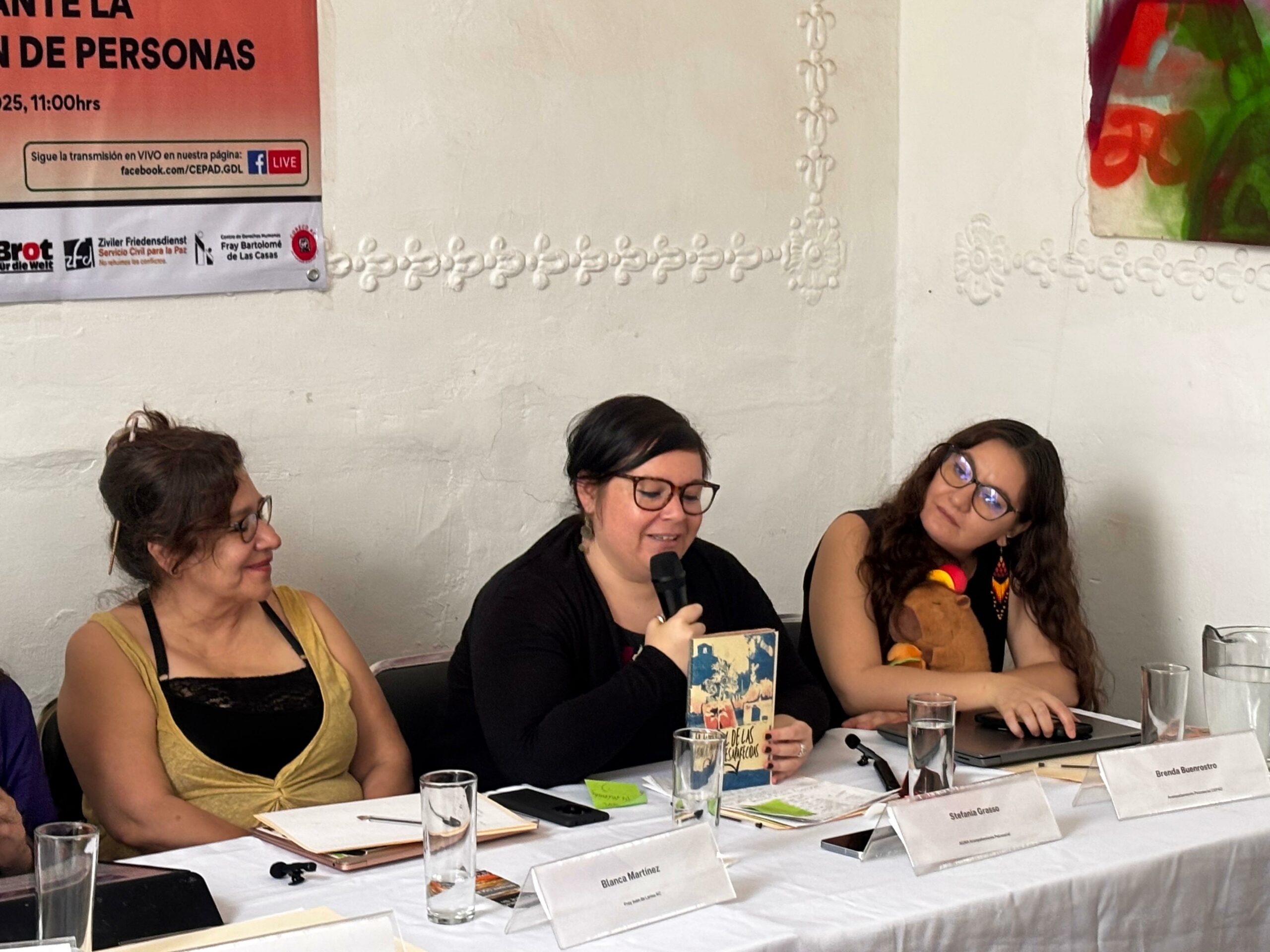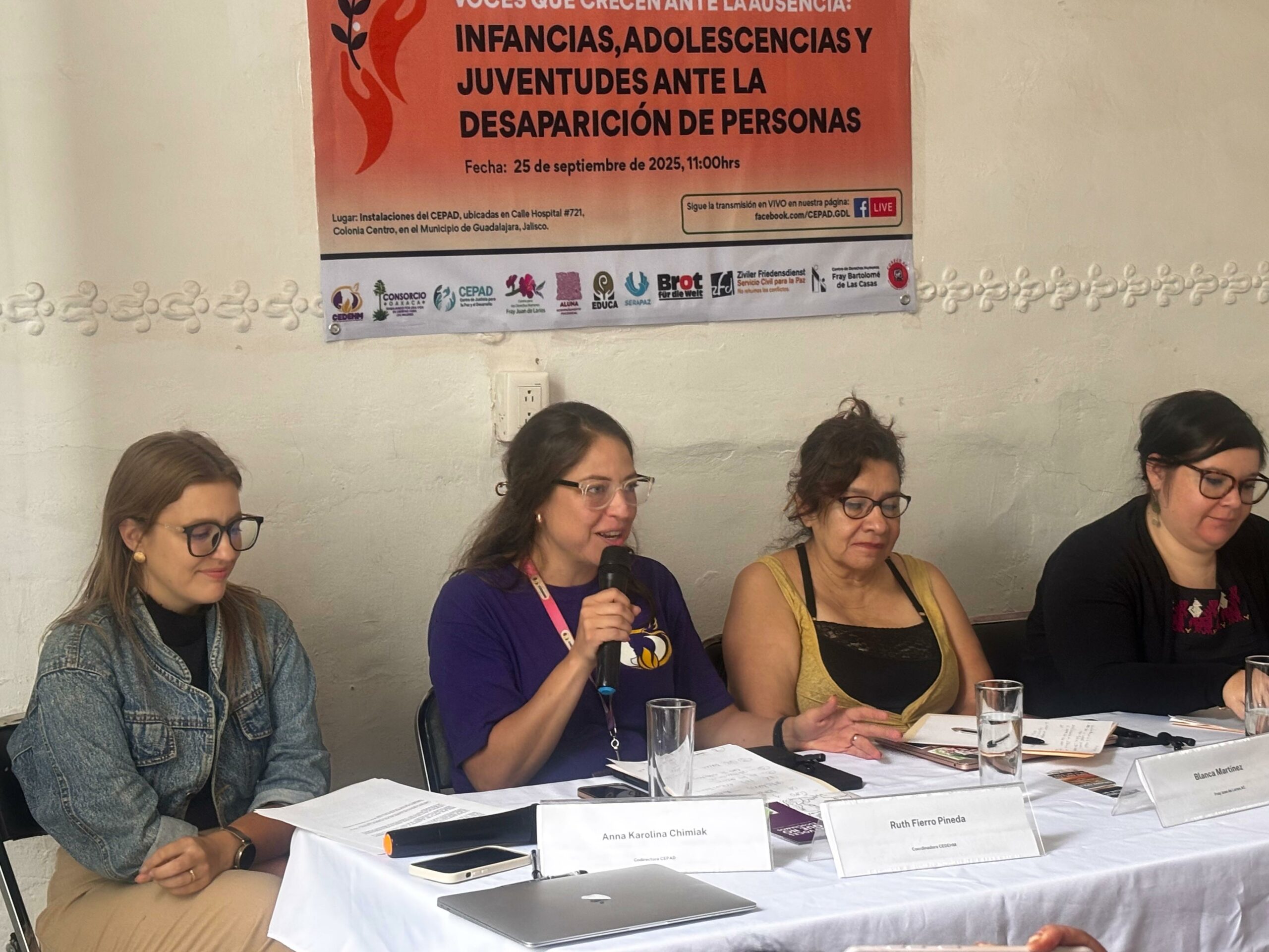 Brenda Buenrostro, psicóloga de CEPAD compartió el proceso de acompañamiento con infancias, adolescencias y jóvenes que CEPAD ha impulsado desde hace varios años. Desde esta experiencia explicó que la desaparición afecta de manera directa a los derechos fundamentales de esta población y se ven reflejados en la desintegración familiar, la caída del rendimiento escolar, el deterioro económico de sus unidades familiares y de condiciones de vida, así como problemas en las relaciones sociales. A esto se suma la estigmatización y señalamiento en sus entornos cercanos como la escuela, la comunidad o su propia familia, lo que refuerza el aislamiento y la sensación de desprotección en infancias y adolescencias.