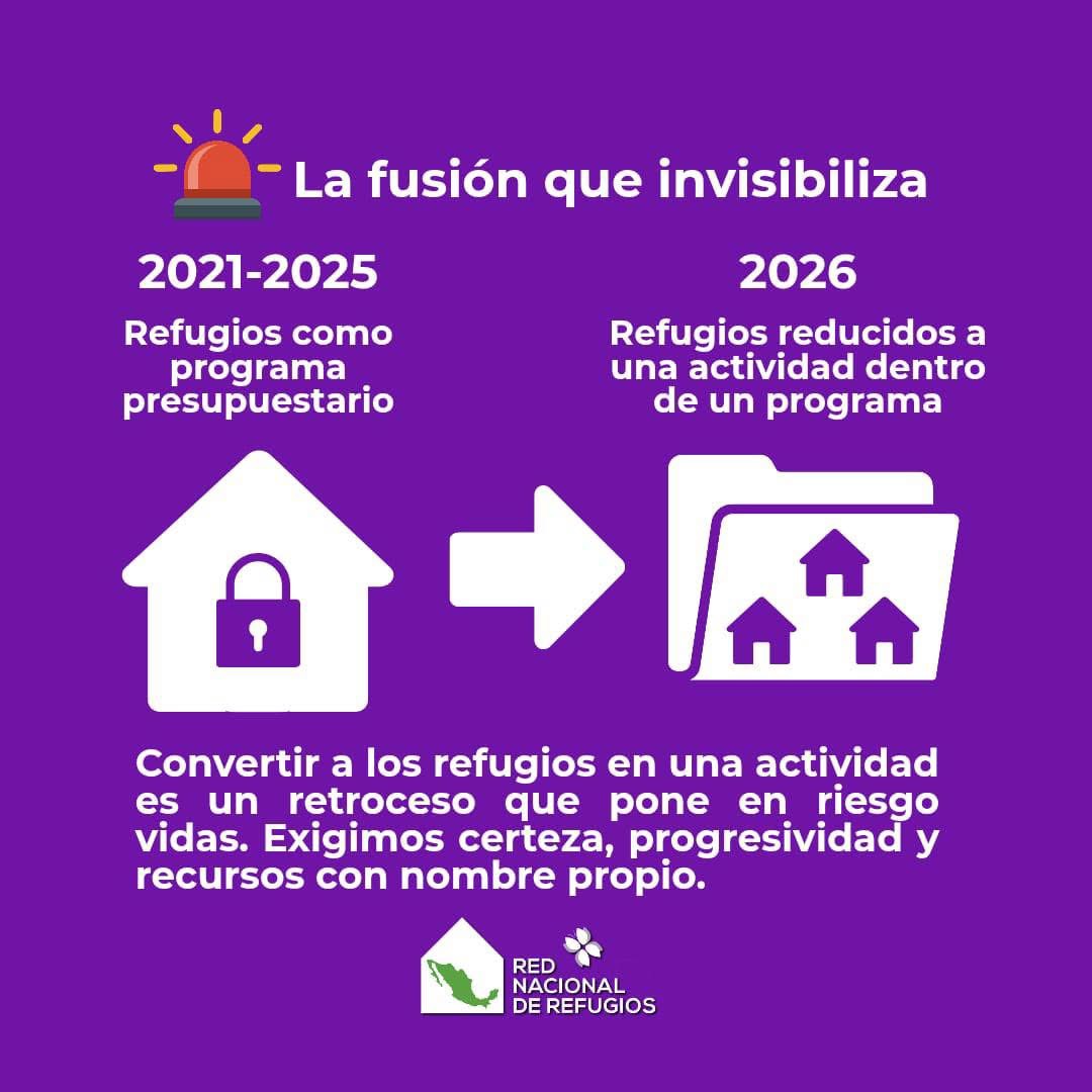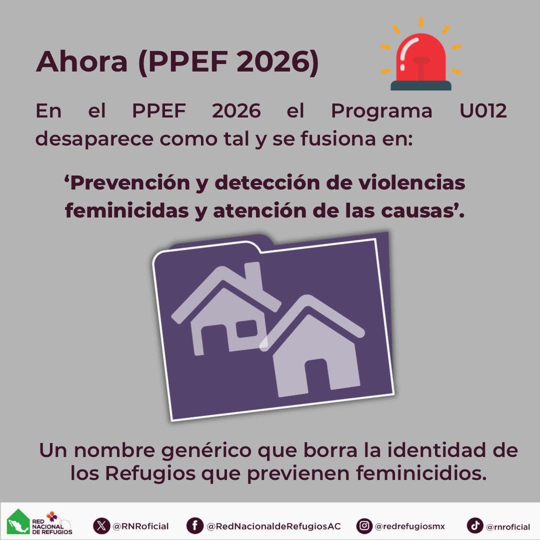 La Red Nacional de Refugios (RNR) denunció que el “Proyecto Presupuestario de Egresos de la Federación 2026 (PPEF 2026) al fusionar el U012- “Programa de Apoyo para Refugios Especializados para Mujeres Víctimas de Violencia de Género, sus hijas e hijos”, el cual existe desde el año 2021, con el “Programa para la Prevención y Detección de las Violencias Feminicida y la Atención de las Causas”, es un gran retroceso para los derechos humanos y la protección de las mujeres y sus hijxs; invisibilizando los refugios tras la poca transparencia que tiene este nuevo plan.
