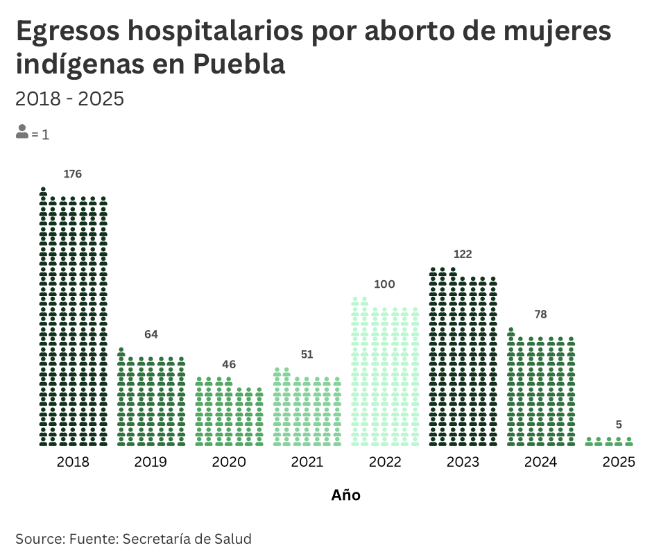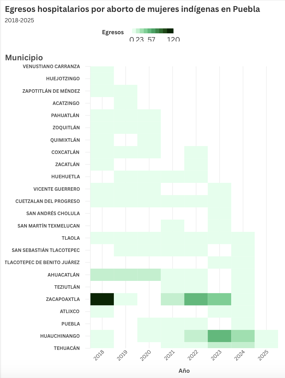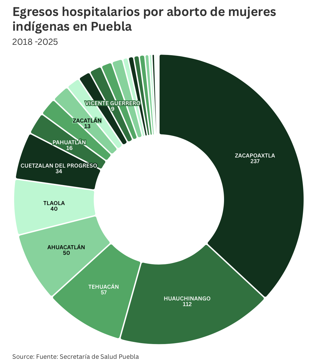 La Secretaría de Salud reportó 642 egresos hospitalarios por aborto de 2018 a 2025 de mujeres hablantes de lengua indígena. El primer lugar municipal es Zacapoaxtla, con 237 casos y que representan el 36.9% del total; luego sigue Huauchinango, con 112 casos; Tehuacán, con 57; Ahuacatlán, con 50 casos, Tlaola, con 40; Cuetzalan, con 34 y Pahuatlán, con 16.
