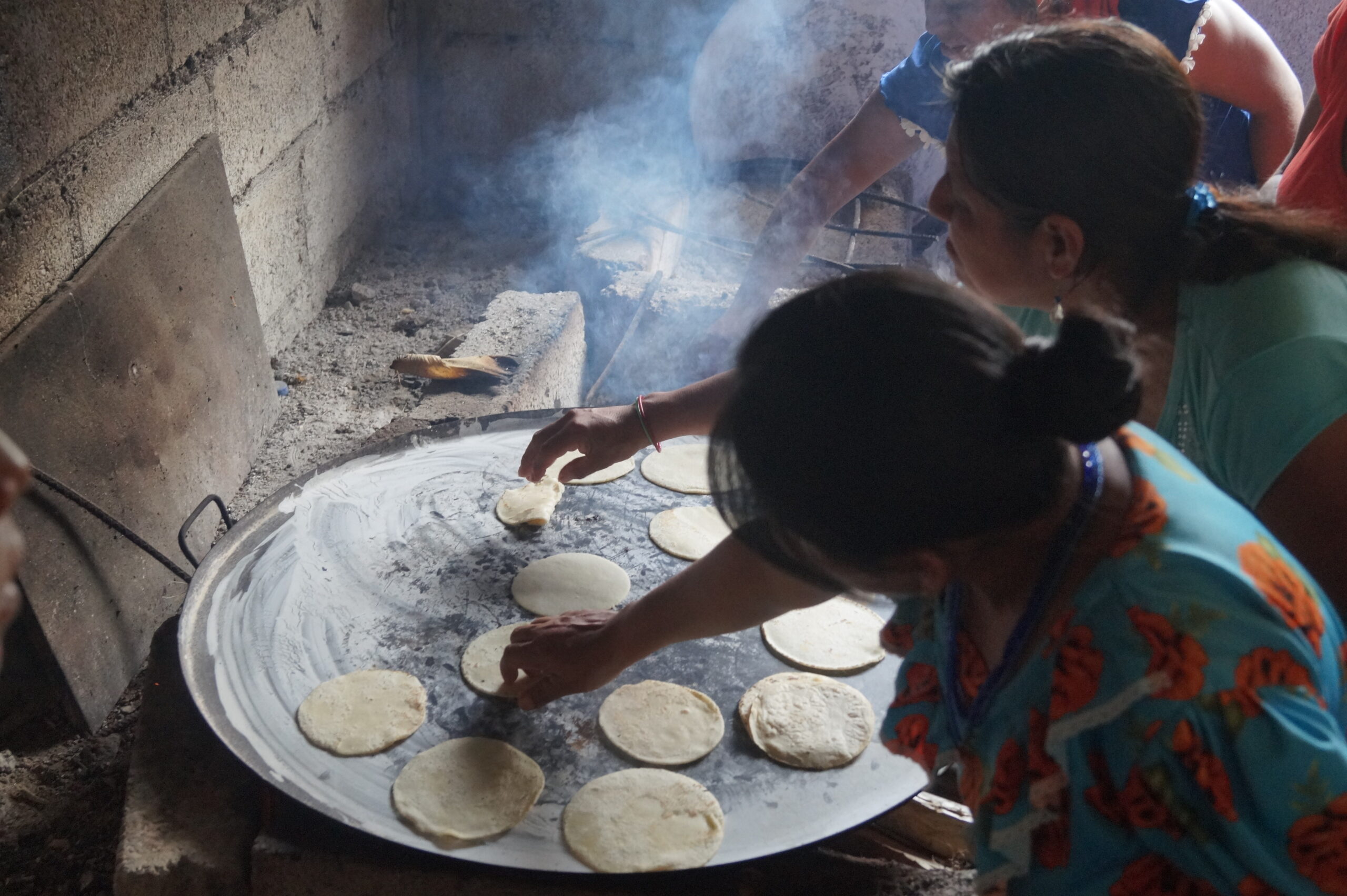 Una veintena de mujeres prepara la comida en un pequeño cuarto ubicado al costado del salón de usos múltiples de la primaria. Todas llevan vestidos, faldones y blusas bordadas con flores. Se comunican en náhuatl mientras preparan el nixtamal. Una mujer palmea la masa y otra vigila un comal al que le caben poco más de 20 tortillas. Al maíz lo echó a perder la lluvia y comprarlo ni siquiera les pasa por la cabeza.