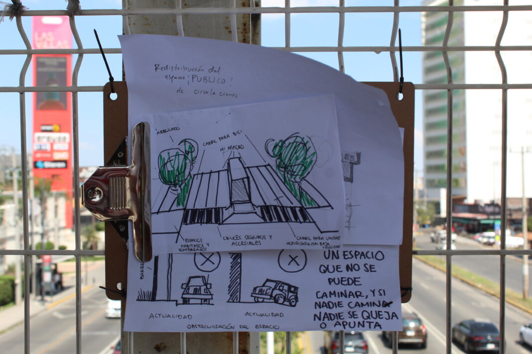 Si bien, cada participante propuso ideas diferentes sobre cómo podría solucionarse la problemática, coincidían en que este diseño de ciudad, especialmente, esta vialidad, mantiene una deuda con las personas que la transitan a pie. Las propuestas, dibujadas en papel, fueron colgadas del puente peatonal como una forma de intervención artística.