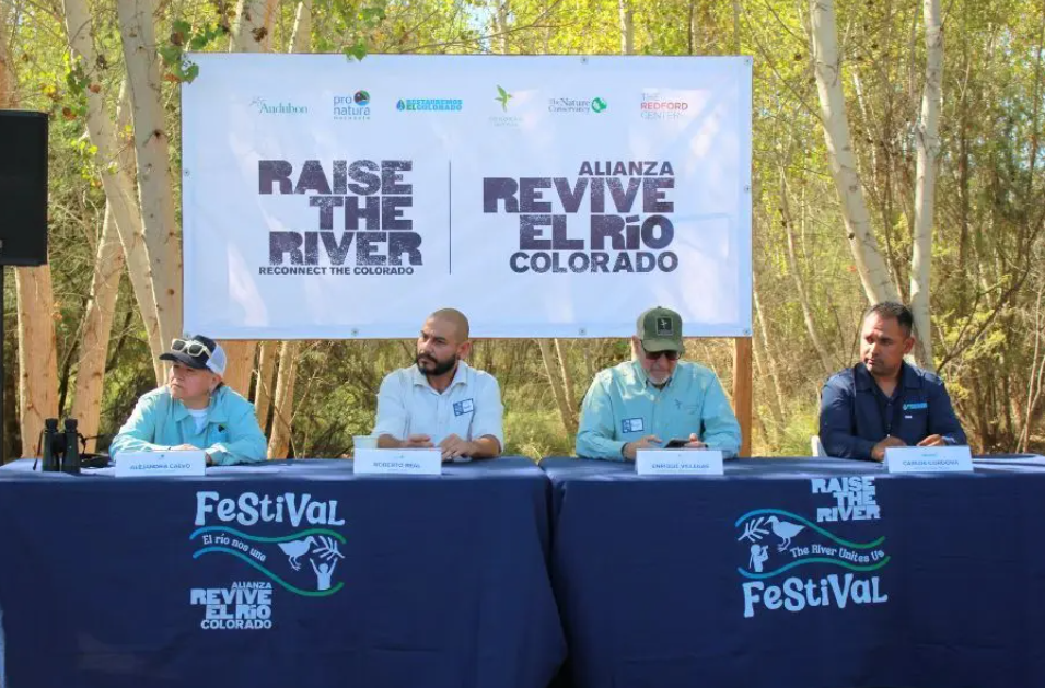 Alejandra Calvo, Pronatura Noroeste; Roberto Real, The Nature Conservancy México; Enrique Villegas, Sonoran Institute; y Carlos Córdova, Restauremos El Colorado durante el festival Revive El Río en octubre de 2025. Fuente: Daniela Reyes.