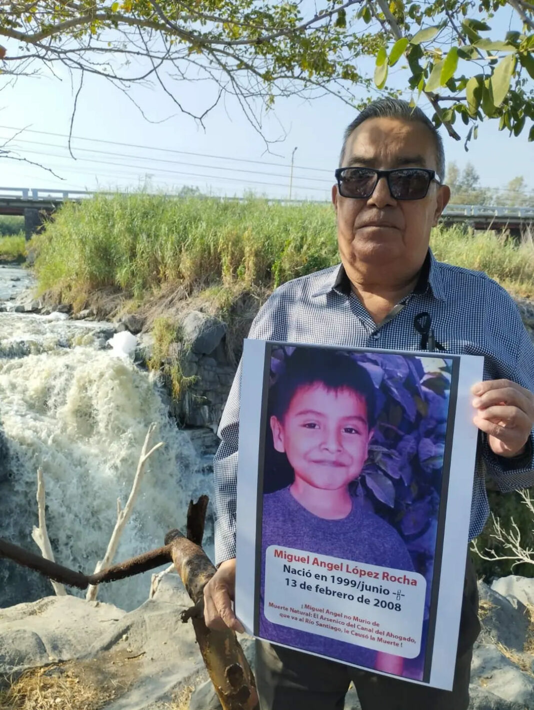 Raúl Muñoz sostiene una imagen del niño Miguel Ángel López Rocha fallecido a causa de la contaminación. En febrero del próximo año será inaugurado un memorial. Foto: Comité Ciudadano de Defensa Ambiental de El Salto.