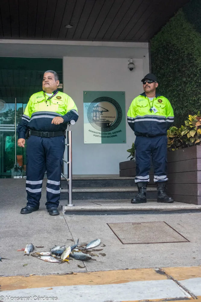 Son al menos 300 personas las congregadas a las afueras de la Administración del Sistema Portuario Nacional (ASIPONA) ante la mirada atenta de militares y elementos de seguridad privada que custodian las instalaciones. “¡Laguna sí, puerto no!” corean los manifestantes mientras un pescador vacía una cubeta de pescados a los pies de los guardias privados. “Eso va a pasar si construyen el Puerto”, gritan, en referencia a la muerte de especies marinas que han advertido organizaciones ambientalistas desde que el Gobierno de México hizo pública su intención de convertir al Puerto de Manzanillo en el más grande de América Latina.