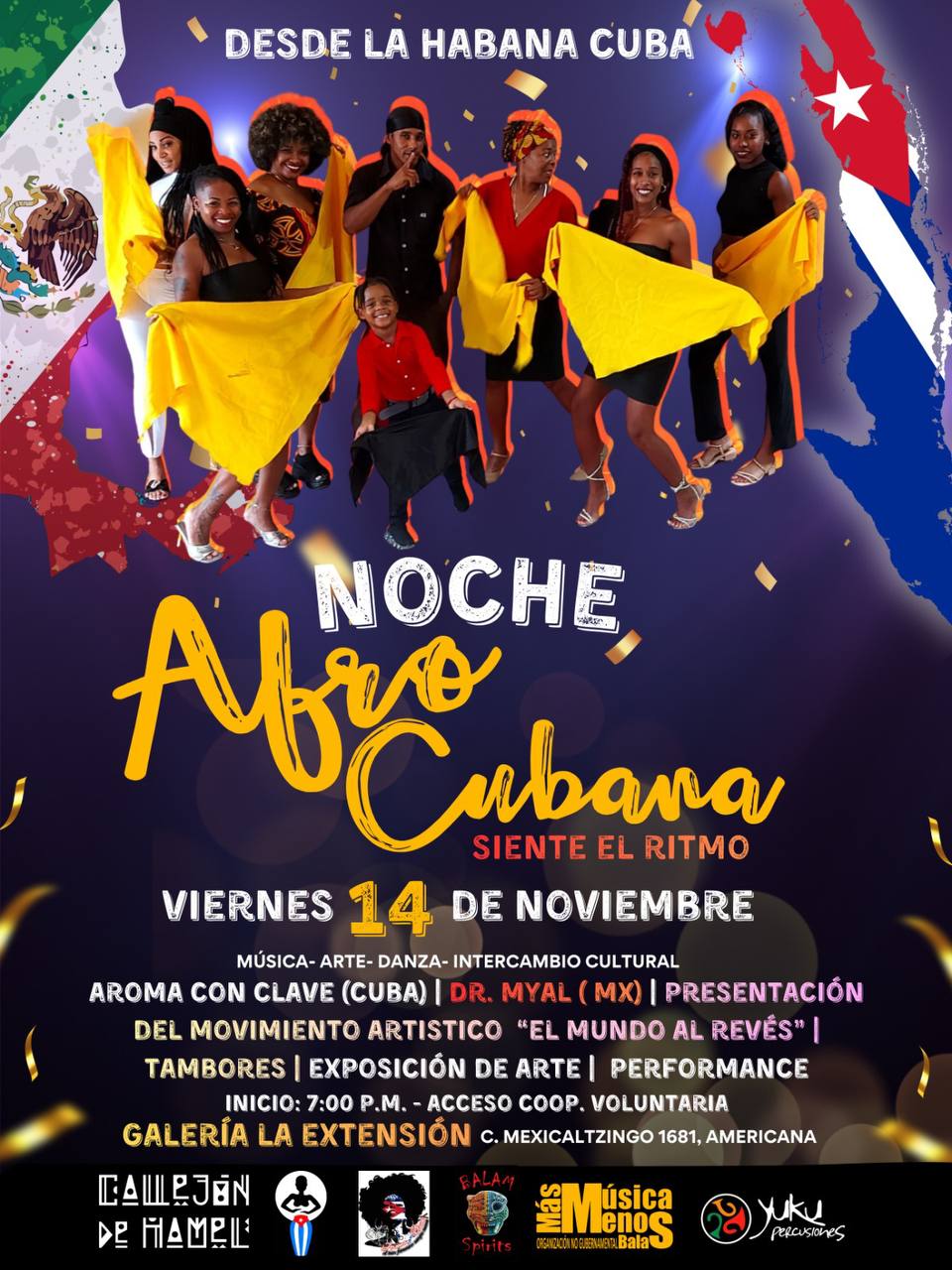 Las actividades iniciarán el jueves 13 de noviembre en Manuel Acuña 1017, con un conversatorio titulado “AfroCuba: Voces que trenzan memoria”, además de presentaciones musicales, intervenciones artísticas y convivencias comunitarias. El viernes 14, la sede será la Galería La Extensión (C. Mexicaltzingo 1681), donde se presentarán Dr. Myal, Tambores Yuku Percusiones y Aroma con Clave, agrupaciones que recrean los sonidos tradicionales del Caribe y la espiritualidad de los orichas del panteón yoruba.