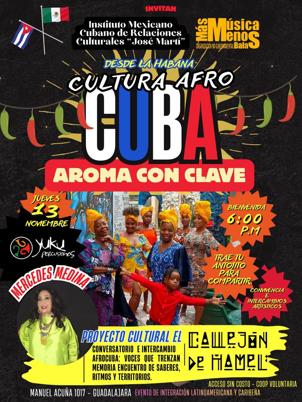 Guadalajara será sede del encuentro “Cultura Afro Cuba: Aroma con Clave” y “Noche Afro Cubana: Siente el Ritmo”, dos jornadas de diálogo y celebración artística que traerán desde La Habana el espíritu del Callejón de Hamel, uno de los proyectos socioculturales más emblemáticos dedicados a la cultura afrocubana.