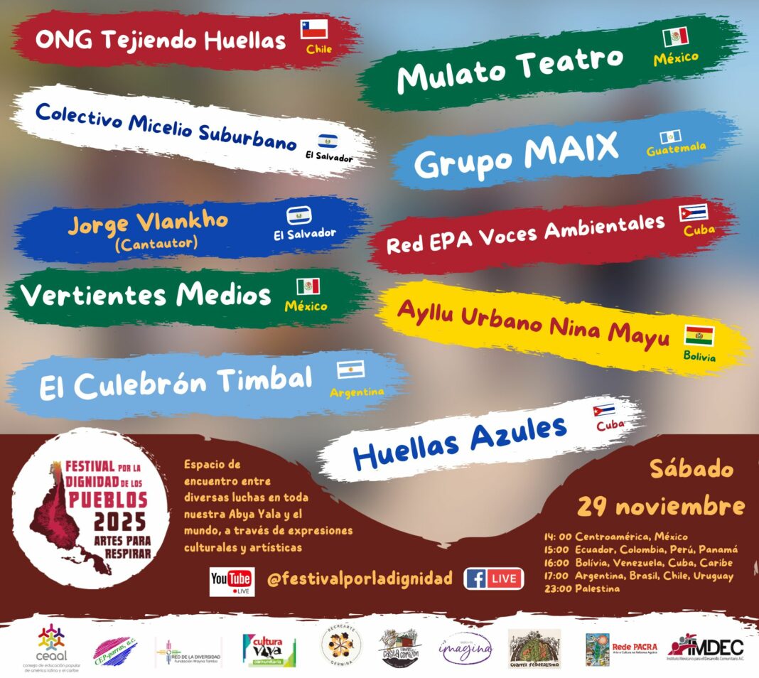 Con el objetivo de ser un espacio de encuentro entre diversas expresiones artísticas y culturales, para visibilizar luchas en toda el Abya Yala, compartir denuncias y anuncios, y sobre todo fortalecer esperanzas para respirar, este sábado 29 de noviembre, a las 2 pm (hora México) se realizará el Sexto Festival por la Dignidad de los Pueblos, Artes para Respirar 2025, en el cual participarán diez experiencias de Argentina, Bolivia, Chile, México, El Salvador y Guatemala, en una transmisión en vivo en las redes sociales del Festival.