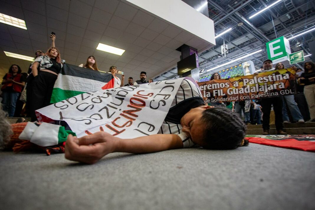 El Comité en Solidaridad con Palestina de Guadalajara realizó una manifestación pacífica dentro de la Feria Internacional del Libro de Guadalajara; en esta acción de resistencia, las y los manifestantes exigieron no sólo el fin al genocidio sino también que Palestina sea el próximo invitado de honor en la FIL.