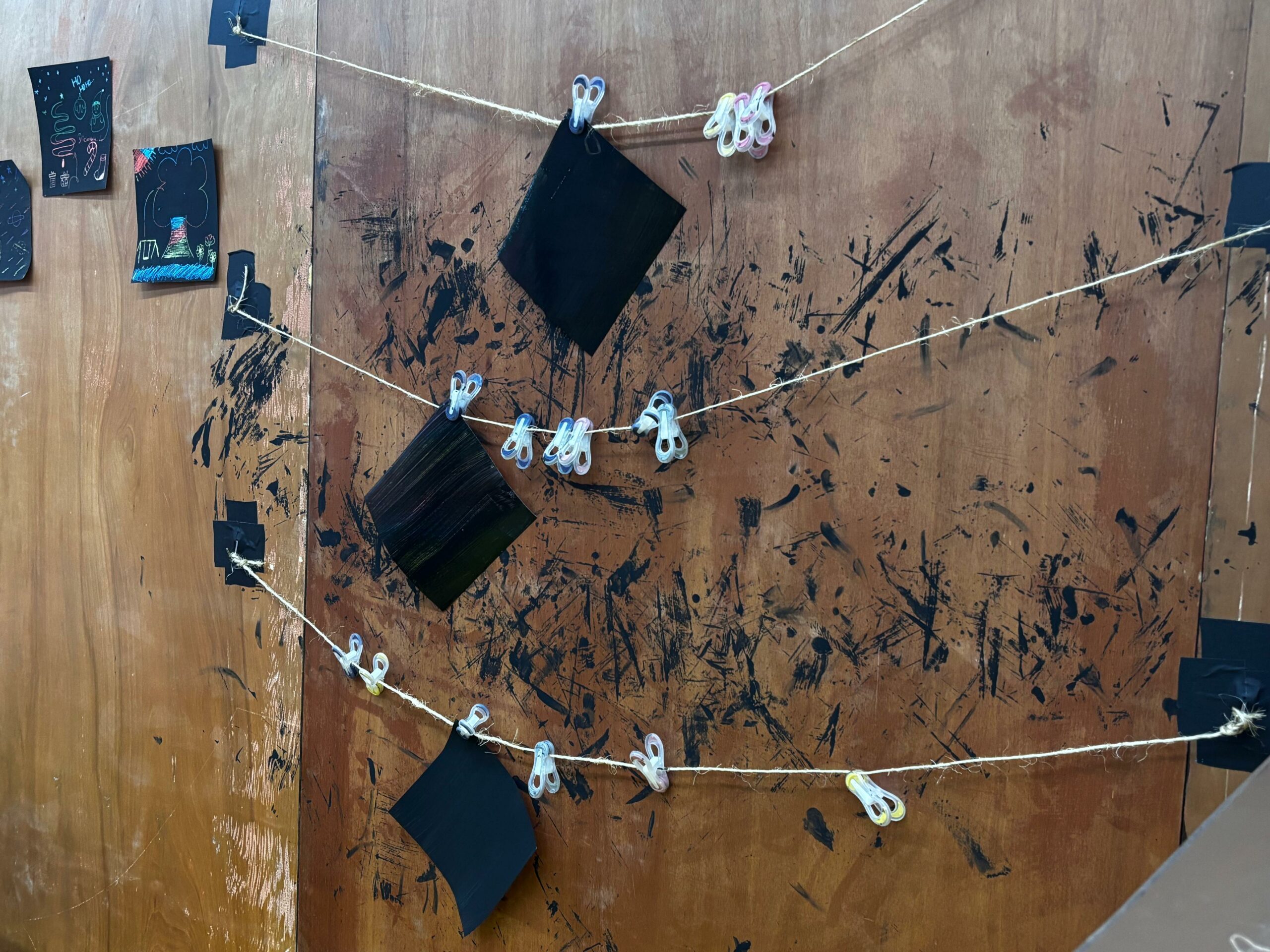 A través de esta dinámica cada niña y niño genera una imagen que emerge poco a poco al raspar la capa negra, revelando los colores que eligieron previamente.