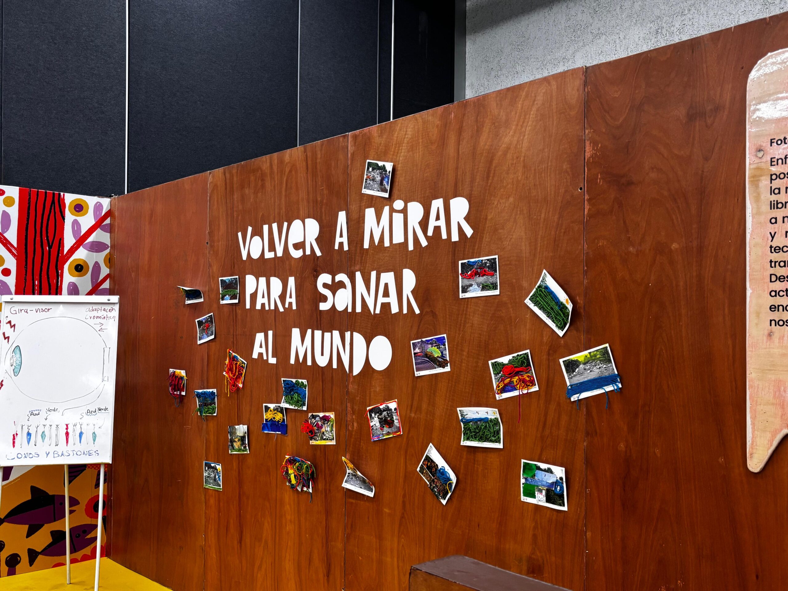Después se realiza un ejercicio de adaptación cromática que busca que las infancias experimenten como cambia su percepción del color dependiendo del contexto y permite que descubran de manera sencilla fenómenos visuales que forman parte de la vida diaria: