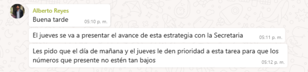 En las semanas previas a la reunión de junio de 2024 había una gran presión de Carlos Alberto Reyes, el directivo de la CNB, para que se validaran los cuestionarios y, de ese modo, se pudiera formalizar el proceso y cambiar el estatus de las personas desaparecidas a localizadas, lo que permitiría reducir el número de registros en el RNPDNO. En un chat de WhatsApp creado en abril de ese año por Reyes, el equipo del organismo tenía que informar sobre las actualizaciones en cada estado: el número de expedientes revisados, los documentos faltantes, si la información había sido validada.