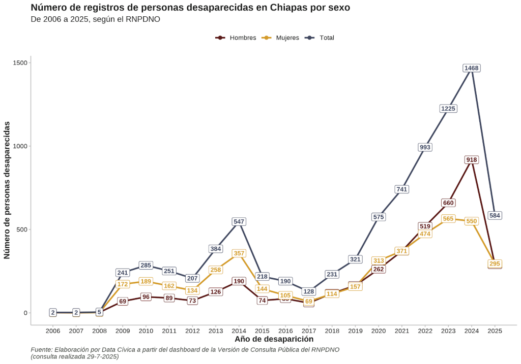 En Chiapas, las desapariciones comenzaron a aumentar en 2018, y fueron en ascenso hasta sumar 8,589 personas en el primer semestre de 2025, según un registro que hizo Data Cívica con datos del Registro Nacional de Personas Desaparecidas y No Localizadas (RNPDNO).