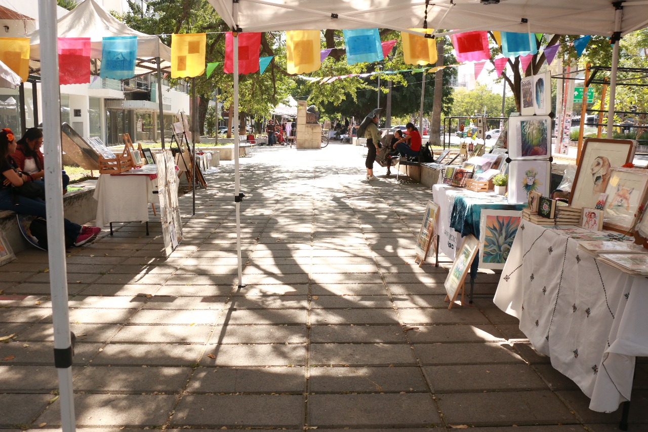 A las diez de la mañana, el andador Chapultepec en Guadalajara comienza a llenarse de colores. Apenas una docena de artistas acomodan sus caballetes, extienden mantas para colocar sus piezas y levantan sombrillas que poco a poco dan forma a la Galería Urbana Rafael Sáenz.