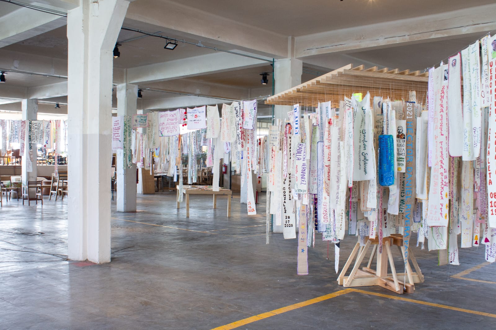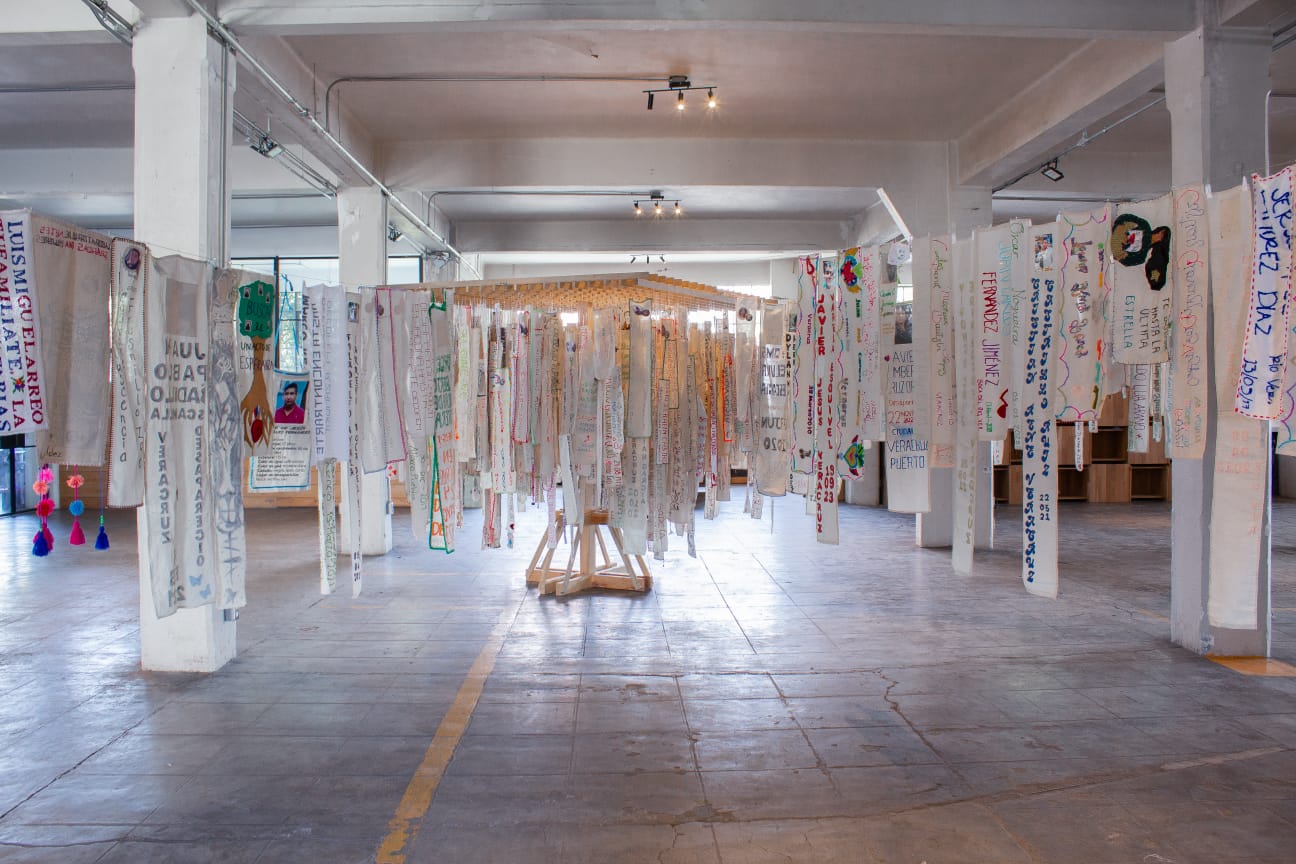 “Nombrarles a todxs” es una instalación y archivo textil desarrollado por la artista multidisciplinaria mexicana Fabiola Rayas y el colectivo Familiares Caminando por Justicia, en colaboración con otros colectivos y personas solidarias. La pieza articula prácticas artísticas y de memoria para nombrar a personas desaparecidas y a víctimas de graves violaciones a derechos humanos en México, a partir de un archivo construido con los nombres compartidos de forma directa y autorizada por sus familias.
