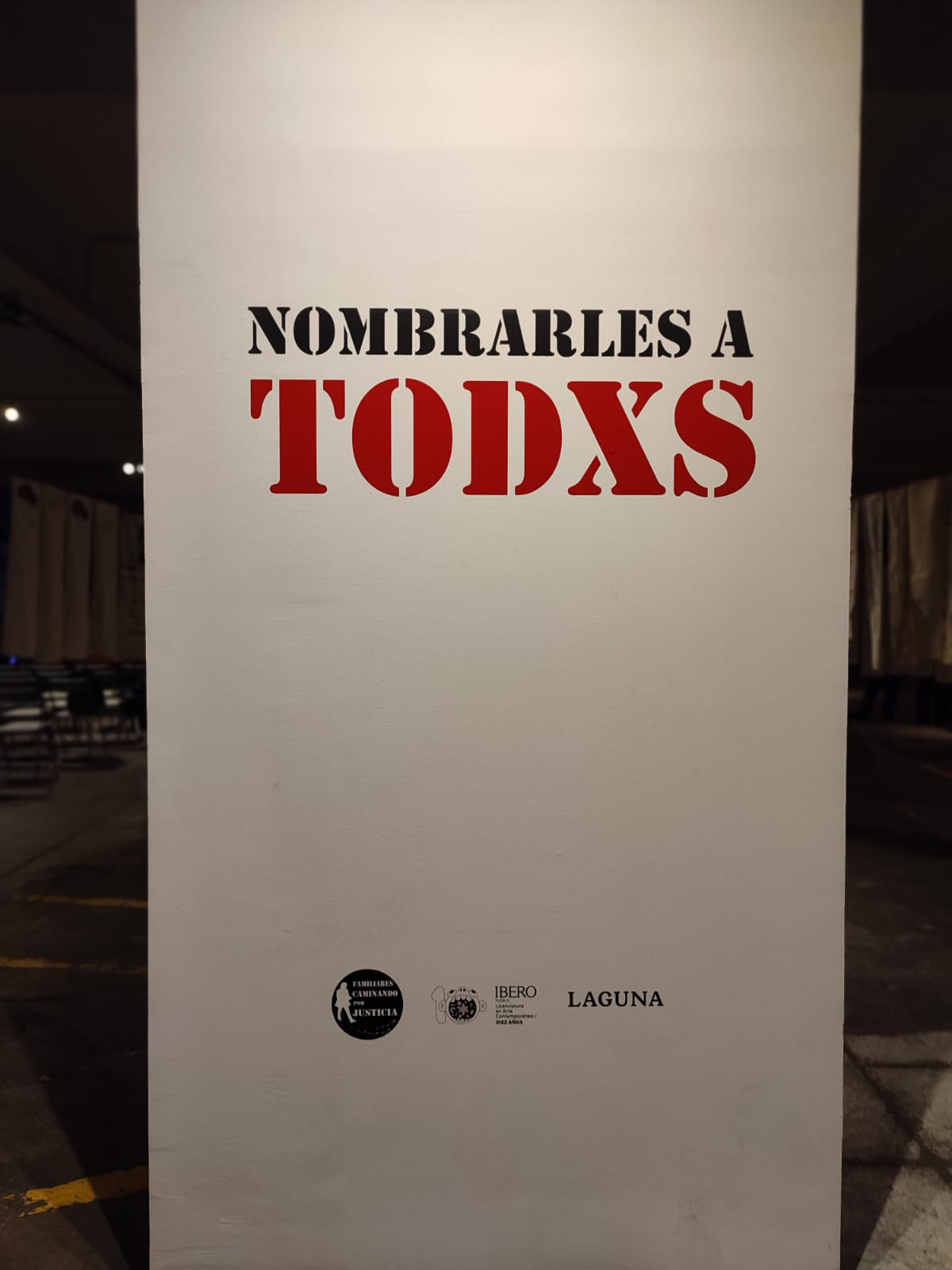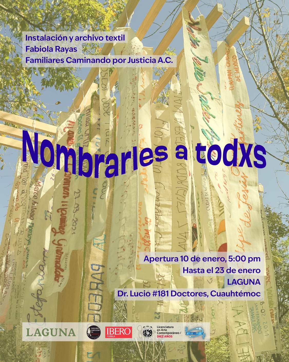 Nombrarles a todxs se presenta por primera vez como una pieza independiente. Aunque normalmente forma parte de la exposición Caminar el cuerpo desaparecido, dedicada al trabajo de memoria de la organización, ahora la obra inicia un recorrido propio. Actualmente se encuentra expuesta del 10 al 23 de enero en el espacio colaborativo LAGUNA, ubicado en Dr. Lucio #181 Doctores, Cuauhtémoc, Ciudad de México. En febrero se exhibirá en Zamora, en la Casa de la Cultura, y más adelante continuará su itinerancia a través de talleres y activaciones con colectivos en distintos estados.