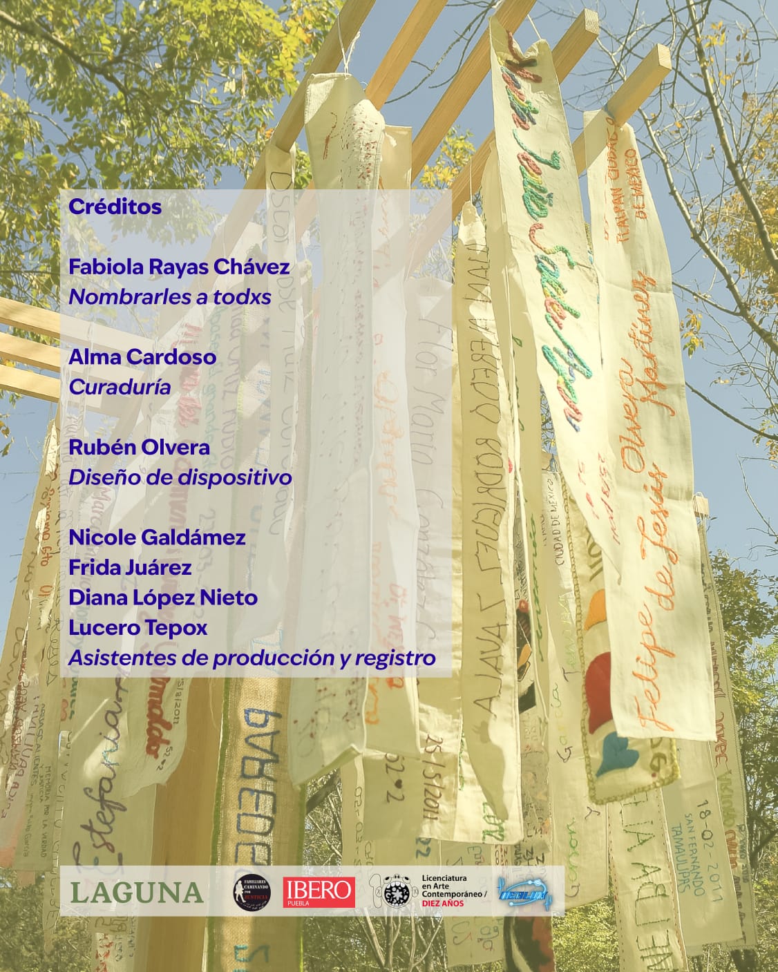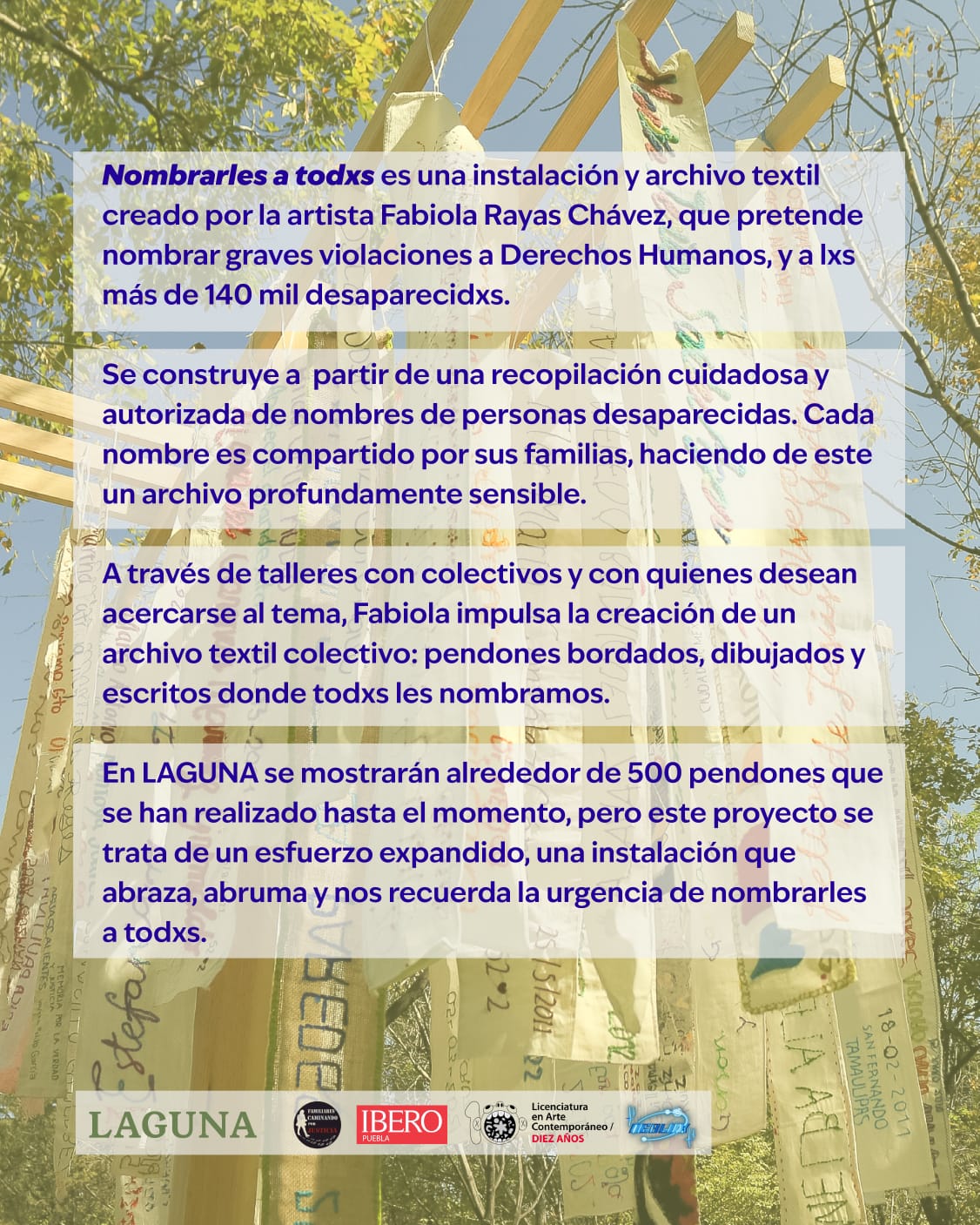 El proyecto se materializa a través de talleres y procesos colectivos que dan lugar a pendones bordados, escritos y dibujados, los cuales conforman un archivo textil en expansión. En LAGUNA se presentará una selección de alrededor de 500 pendones realizados hasta ahora. La exposición cuenta con la curaduría de Alma Cardoso, el diseño del dispositivo de Rubén Olvera y el acompañamiento en producción y registro de Nicole Galdámez, Frida Juárez, Diana López Nieto y Lucero Tepox, quienes forman parte del equipo que hace posible esta presentación.