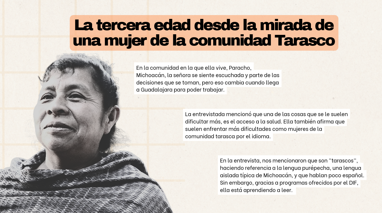 Por otro lado, la experiencia de envejecer está profundamente atravesada por el contexto cultural. Mientras que en las zonas urbanas el trabajo en la vejez suele ser sinónimo de precariedad, en algunas comunidades indígenas la visión es distinta. Una mujer de la comunidad Tarasco en Michoacán, dedicada a realizar artesanías y venderlas en el centro histórico de Guadalajara, explica que en su entorno las personas adultas mayores son pilares de sabiduría: “Aquí seguimos trabajando porque es parte de la vida comunitaria… Afuera es diferente: te miran como si ya no sirvieras”.