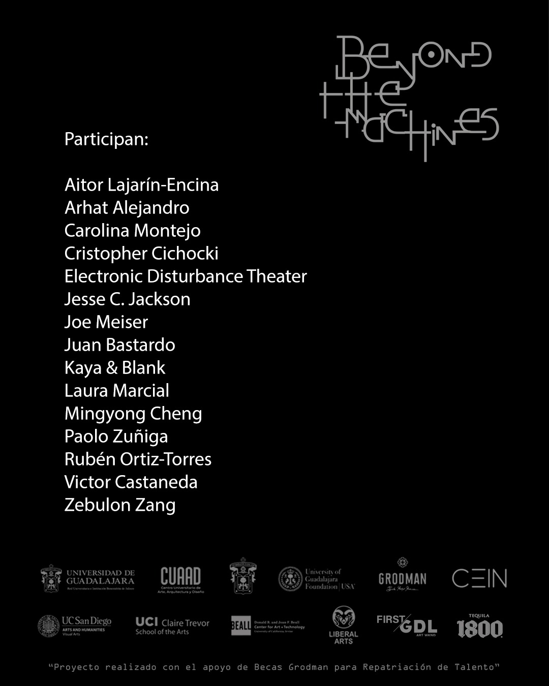 “Más allá de las máquinas” contará con más de 21 obras y reunirá prácticas artísticas que oscilarán entre lo hecho a mano y la producción asistida por tecnologías digitales mediante pintura, vídeo y objetos híbridos.Entre los artistas participantes se destacan Kaya & Blank, Minyong Cheng, Zebulo Zan y el artista tapatío, Arath Alejandro, quien definió dicha muestra cómo “variada” e “inquietante”.