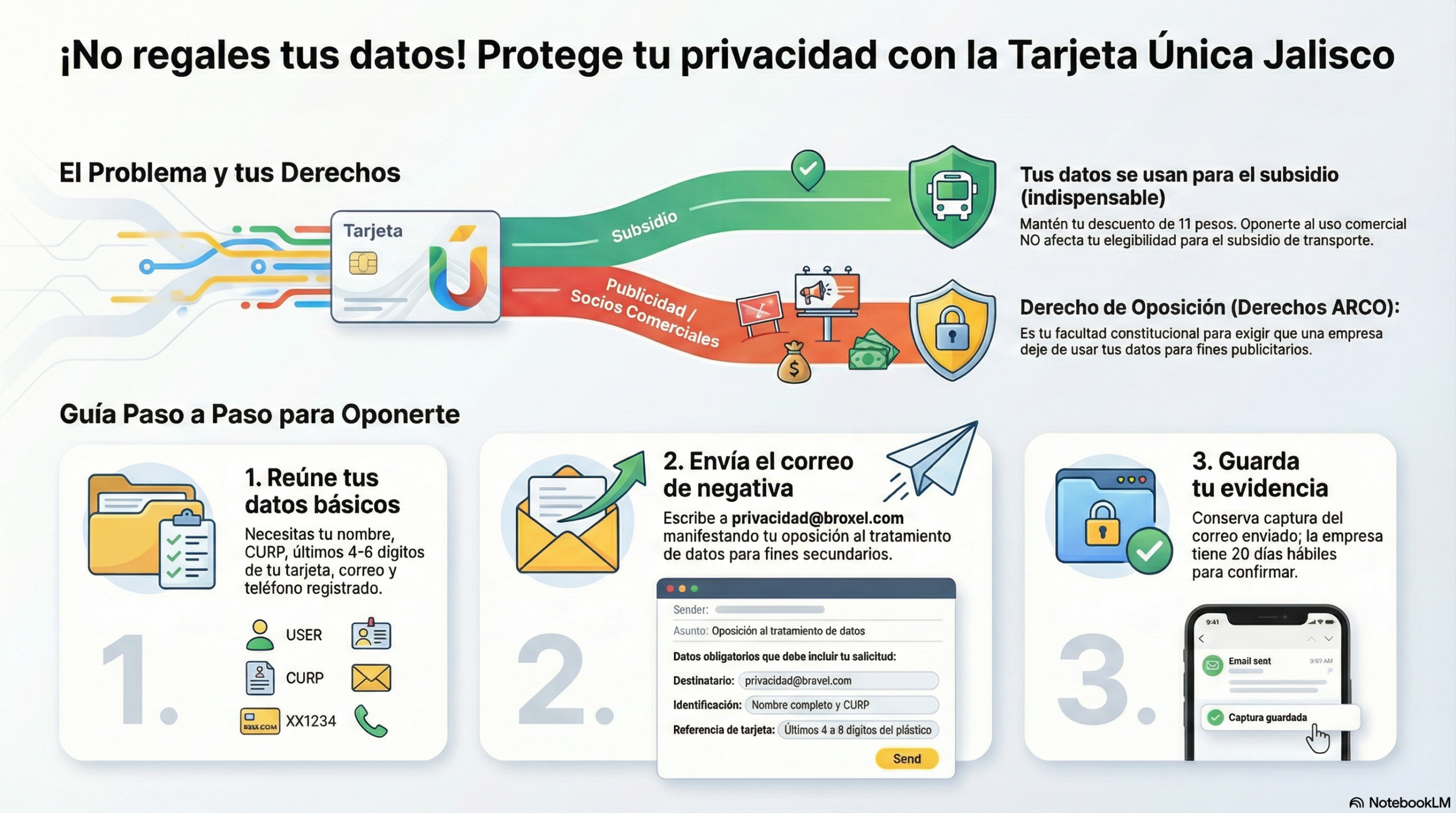 Broxel, la empresa que opera la Tarjeta Única en Jalisco puede usar y compartir los datos personales de quienes la tramitan para fines comerciales gracias a cláusulas poco visibles en sus avisos legales. Aunque el subsidio al transporte está condicionado al registro, existe un camino sencillo para que las personas usuarias se opongan a ese uso comercial de su información sin perder el descuento en la tarifa.