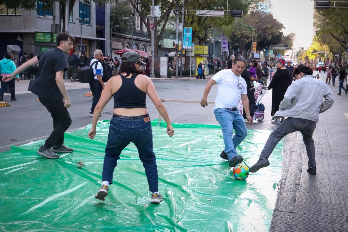Desde temprano llegaron jóvenes, pueblos que defienden su territorio, músicos, artistas visuales, medios libres y colectivos. La plaza se fue poblando también de vendimia autogestiva, puestos de comida comunitaria y espacios lúdicos. Entre ellos, una cancha improvisada de fútbol y futbolito, instalada como gesto político: una protesta contra el Mundial y los proyectos de despojo que lo acompañan.