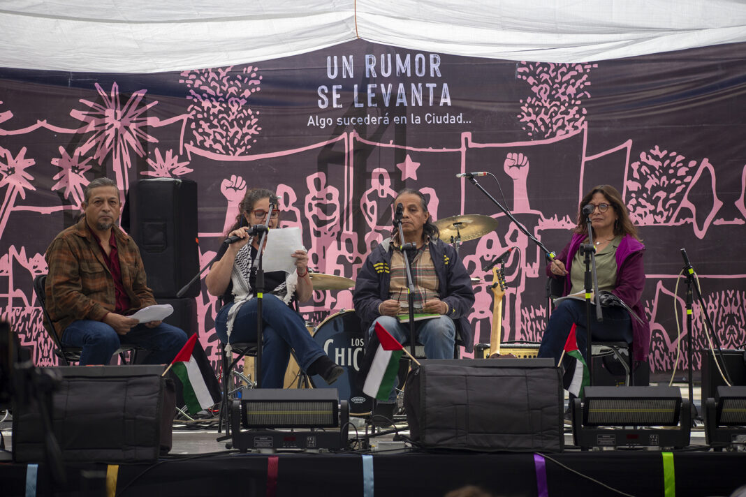 Desde la madrugada, colectivos, pueblos en resistencia, artistas y medios libres tomaron la Plaza Palestina Libre en la jornada Un rumor se levanta, un encuentro político-cultural donde la palabra colectiva denunció el despojo territorial, la desaparición forzada, el acaparamiento del agua y la mercantilización de la ciudad.