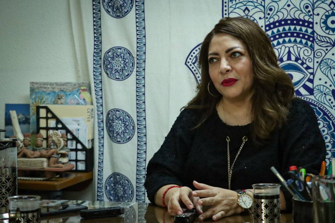 Su oficina, un espacio adaptado en su propia casa al sur de la Ciudad de México, es una mezcla de consultorio médico y estudio “New Age”. Además del esqueleto de la mano y otro del pie, detrás de su escritorio hay un telar con una mano de Fátima, un símbolo protector que se cree proviene de pueblos del norte de África. También tienen un altar con una veladora de San Benito (un santo protector, me dice), un espejo de obsidiana y unos cuarzos; frente a ese altar medita.