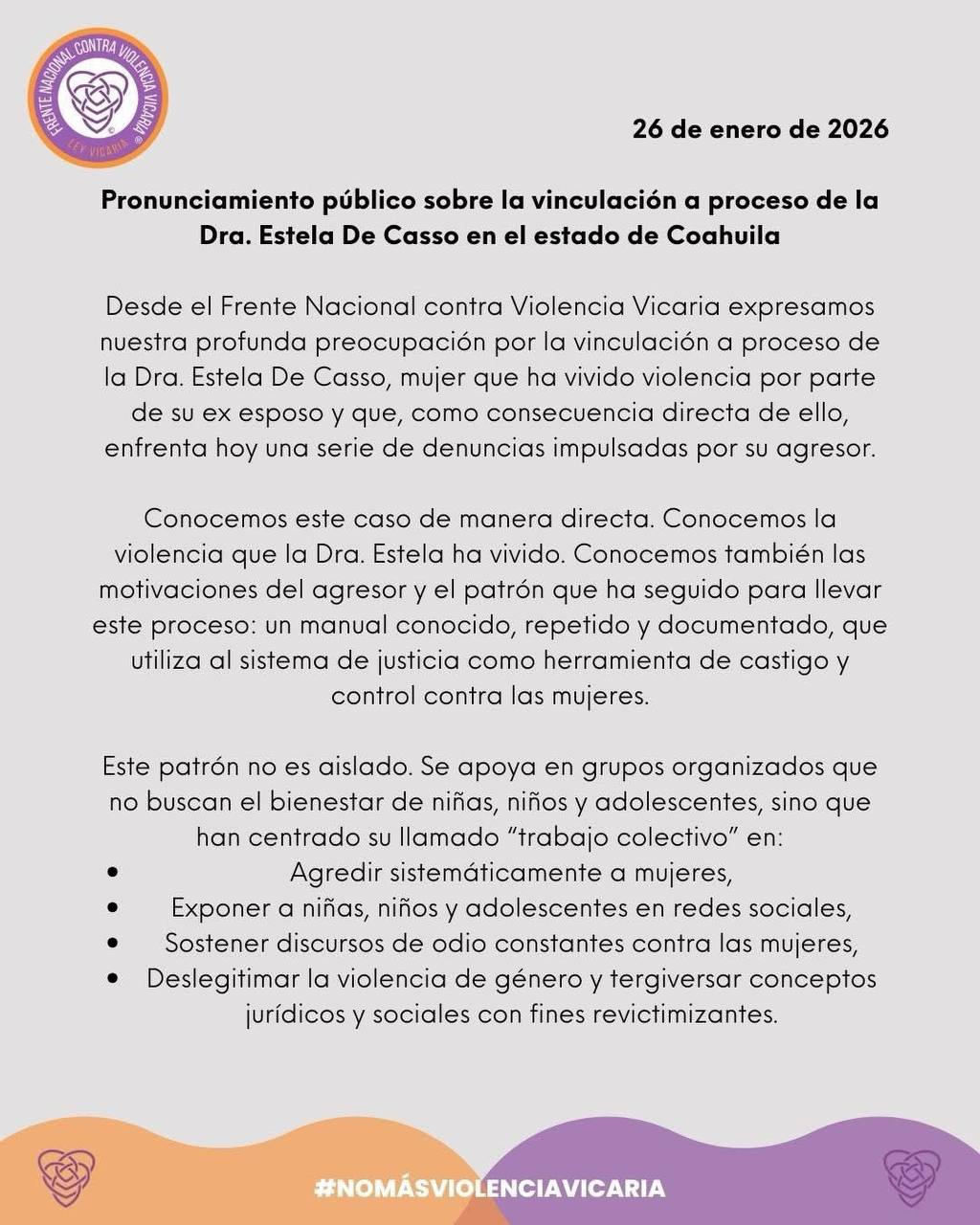 Al respecto, el FNCVV, manifestó su preocupación, señalando que Estela Casso no sólo ha sido víctima de violencia vicaria, sino que, esta acción legal obedece al ejercicio mismo de la violencia que su ex pareja y padre de sus hijos impulsa para seguir causándole daño.