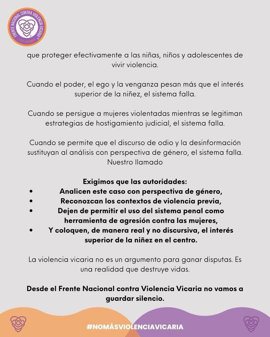 “A partir de ahora, cualquier comentario, cualquier amenaza, mensaje violento será reportado, documentado, eliminado y bloqueado” afirmaron de forma contundente las representantes y fundadoras del Frente Nacional Contra la Violencia Vicaria a través de un pronunciamiento público.