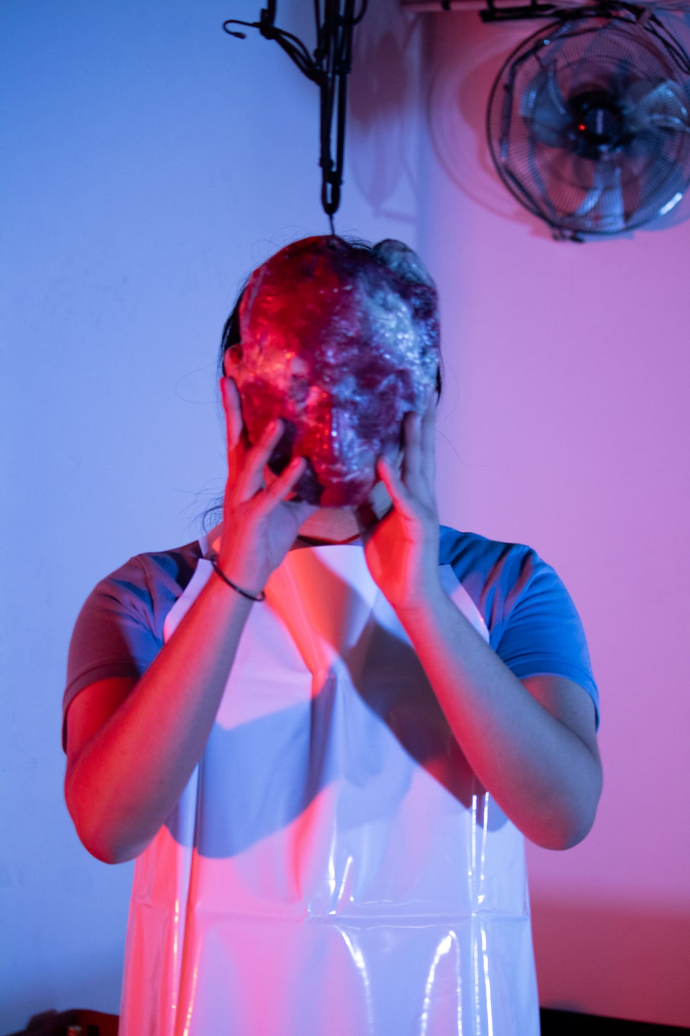 La producción de Pensamiento Carnicero implicó un trabajo colectivo. Miguel Sahid, encargado de la escenografía, explicó que la preparación requirió resolver cómo representar carne sin utilizarla. Aunque cuenta con experiencia en caracterización y utilería, crear piezas con apariencia orgánica representó un reto técnico.