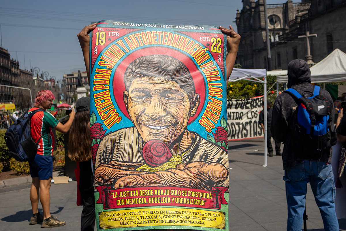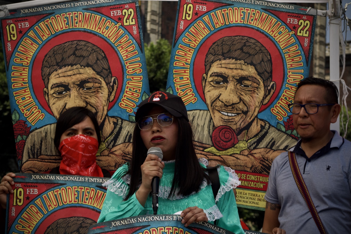 Frente a la Catedral Metropolitana y a un costado del antimonumento sembrado en memoria del comunicador comunitario, familiares, pueblos y colectivos realizaron una conferencia de prensa y un mitin a siete años del asesinato de Samir Flores Soberanes, ocurrido el 20 de febrero de 2019 en Amilcingo, Morelos.