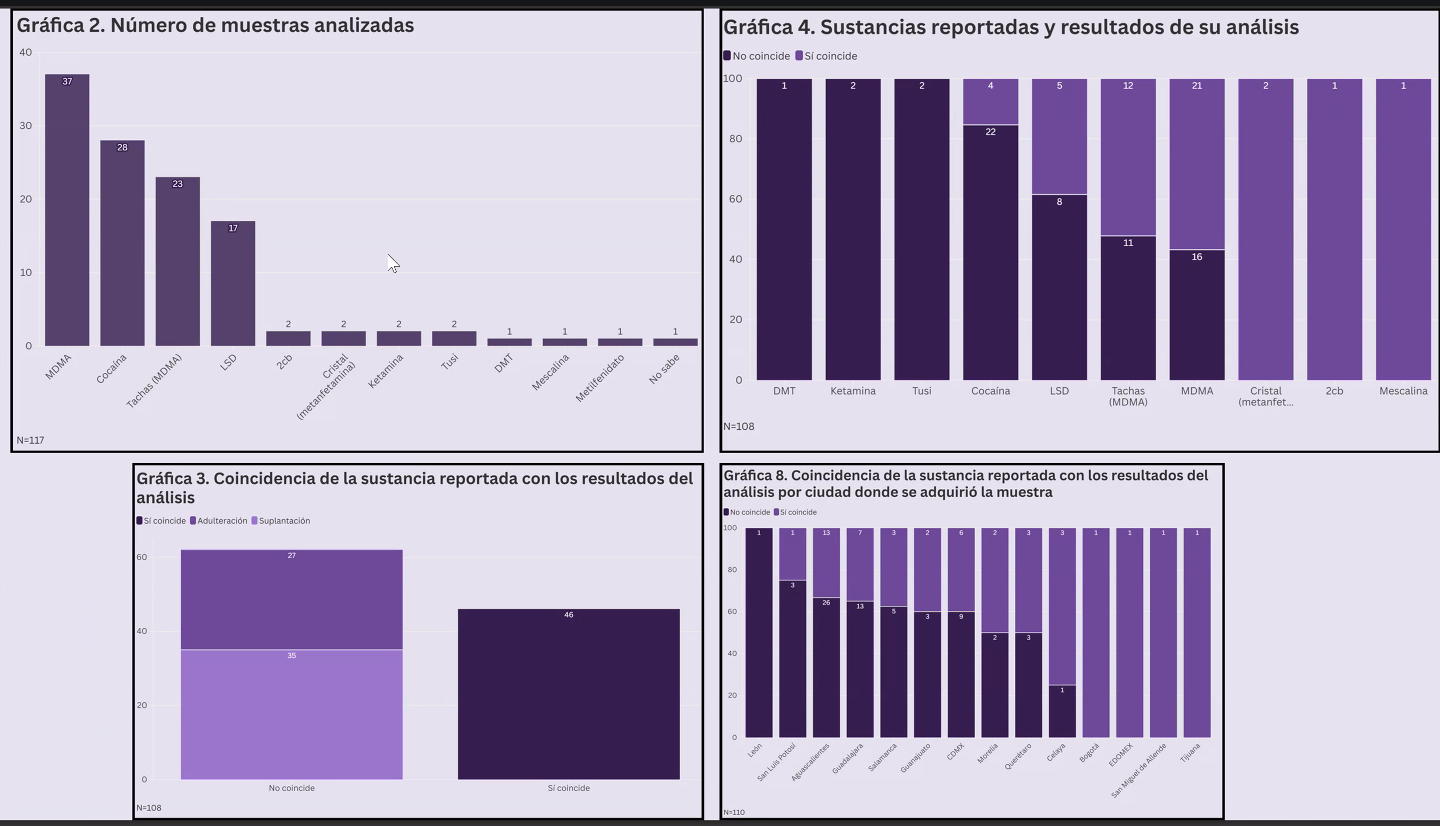 En el caso de la cocaína, 22 muestras no coincidieron con lo reportado y solo cuatro coincidieron exclusivamente con cocaína. En LSD, ocho muestras no coincidieron y cinco sí coincidieron. En MDMA, 21 muestras coincidieron con lo esperado. En el caso de las tachas, 12 coincidieron con la sustancia buscada. Las pocas muestras de DMT, ketamina y tusi no coincidieron con lo reportado.