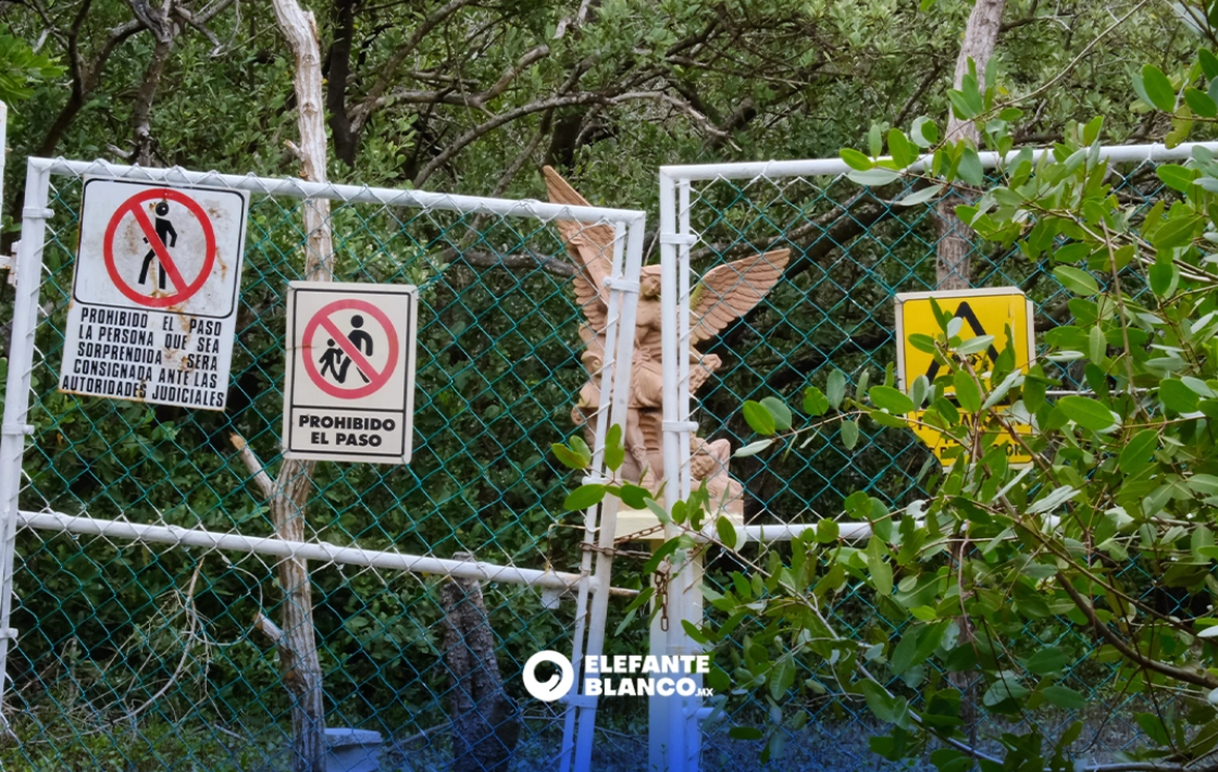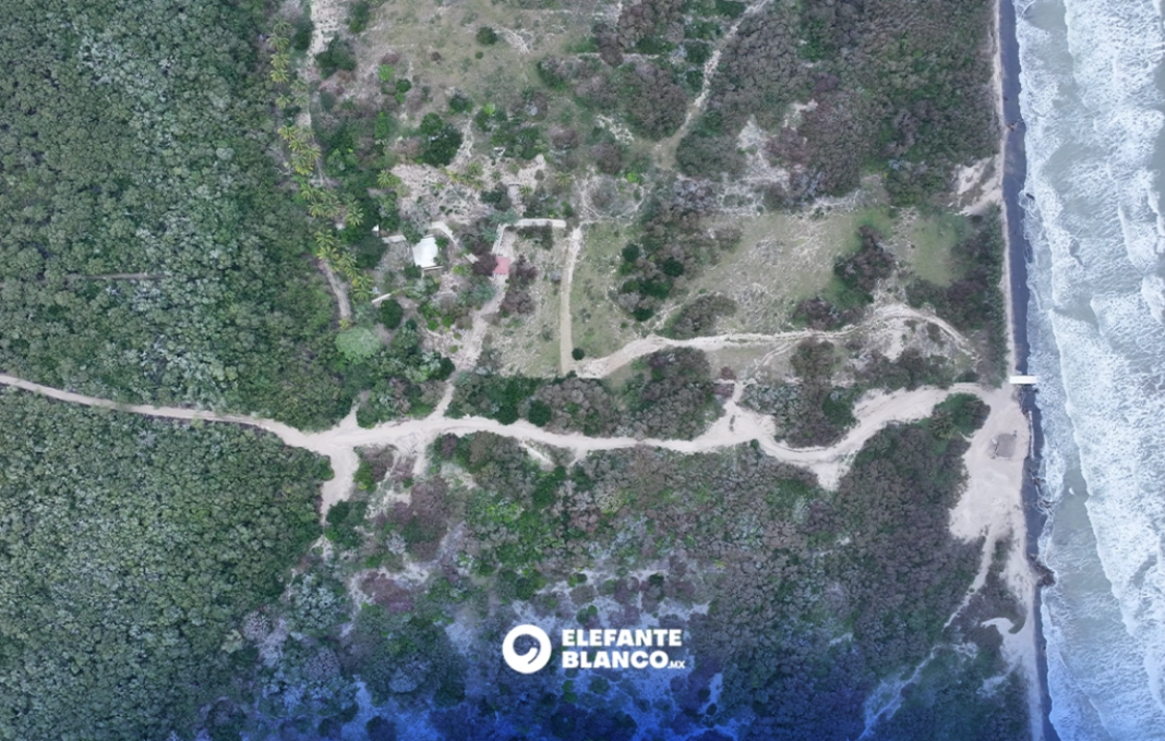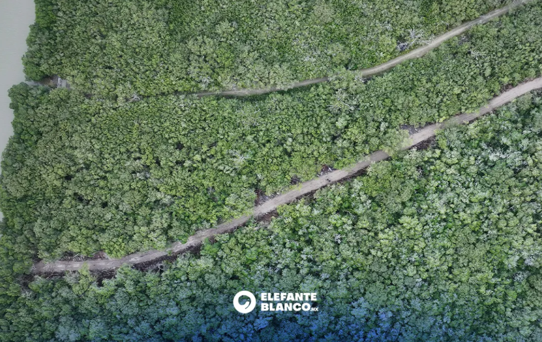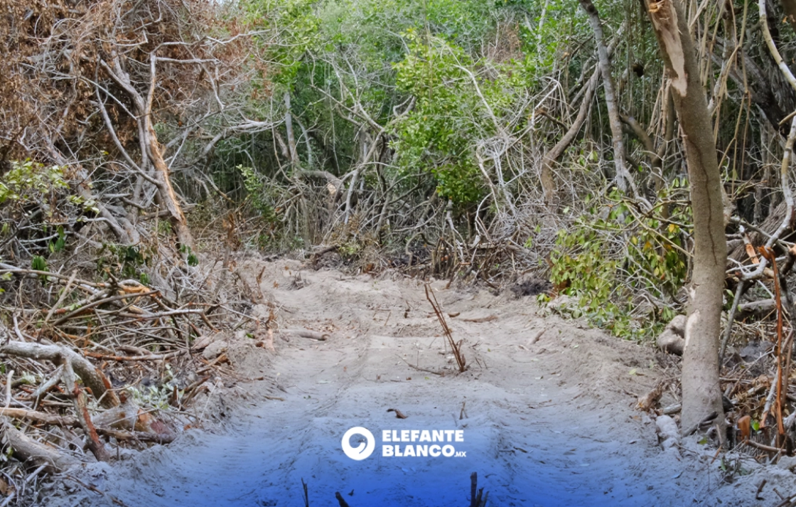 Al recorrer el sendero, el equipo de Elefante Blanco documentó huellas recientes de maquinaria pesada, como trascabos, que removieron ramas y restos del manglar previamente talado. En el sitio también se observaron pequeñas construcciones tipo bodega, prendas de ropa y una estructura tipo palapa en la orilla de la playa equipada con cámaras de seguridad.