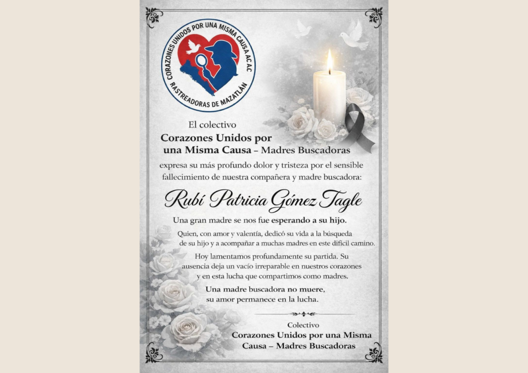 Rubí Patricia Gómez-Tagle, madre buscadora en Mazatlán, fue localizada sin vida el 27 de febrero. El hallazgo ocurrió durante la visita de la Presidenta Claudia Sheinbaum a Sinaloa y derivó en la suspensión de una jornada de búsqueda.