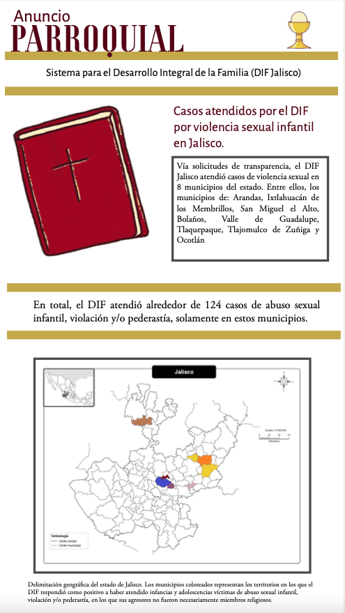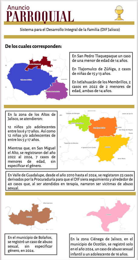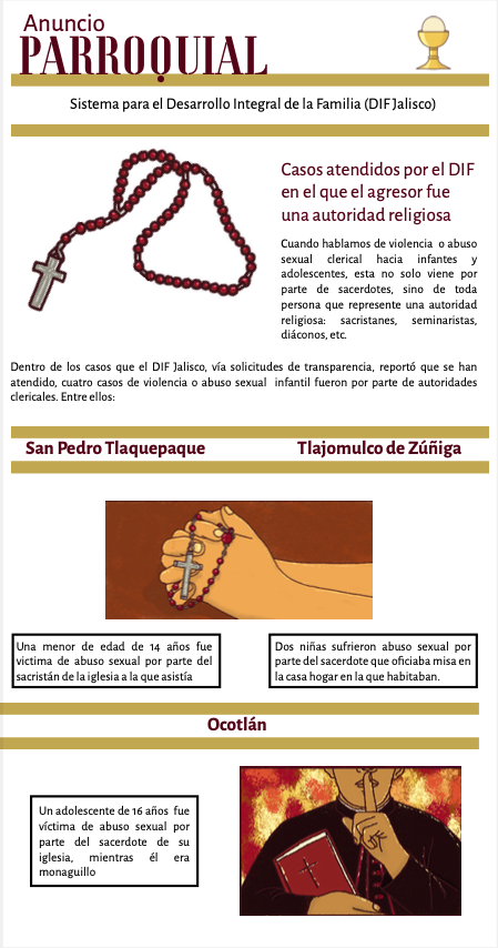 El escenario, -como se planteó antes-, se vuelve más complejo cuando esta violencia sexual se ejerce por integrantes de cultos religiosos. A través de Solicitudes de Acceso a la Información, los DIF municipales de Ocotlán (Folio: 140249325000007), Tlajomulco de Zúñiga (Folio: 140252925000009) y Tlaquepaque (Folio; 140251025000006) reportaron que en los últimos 10 años (2014 a 2024) se atendieron diversos casos de infancias y adolescencias que fueron  víctimas de agresiones sexuales cometidas por personas que trabajan dentro de iglesias católicas.