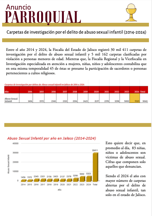 Entre 2014 y 2024, la Fiscalía del Estado de Jalisco registró 30 mil 411 carpetas de investigación por el delito de abuso sexual infantil y 5 mil 162 carpetas clasificadas por violación a personas menores de edad. Mientras que, la Fiscalía Regional y la Vicefiscalía en Investigación Especializada en Atención a mujeres, niñas, niños y adolescentes contabiliza en esta misma temporalidad 45 carpetas donde se presume la participación de sacerdotes o personas pertenecientes a cultos religiosos.