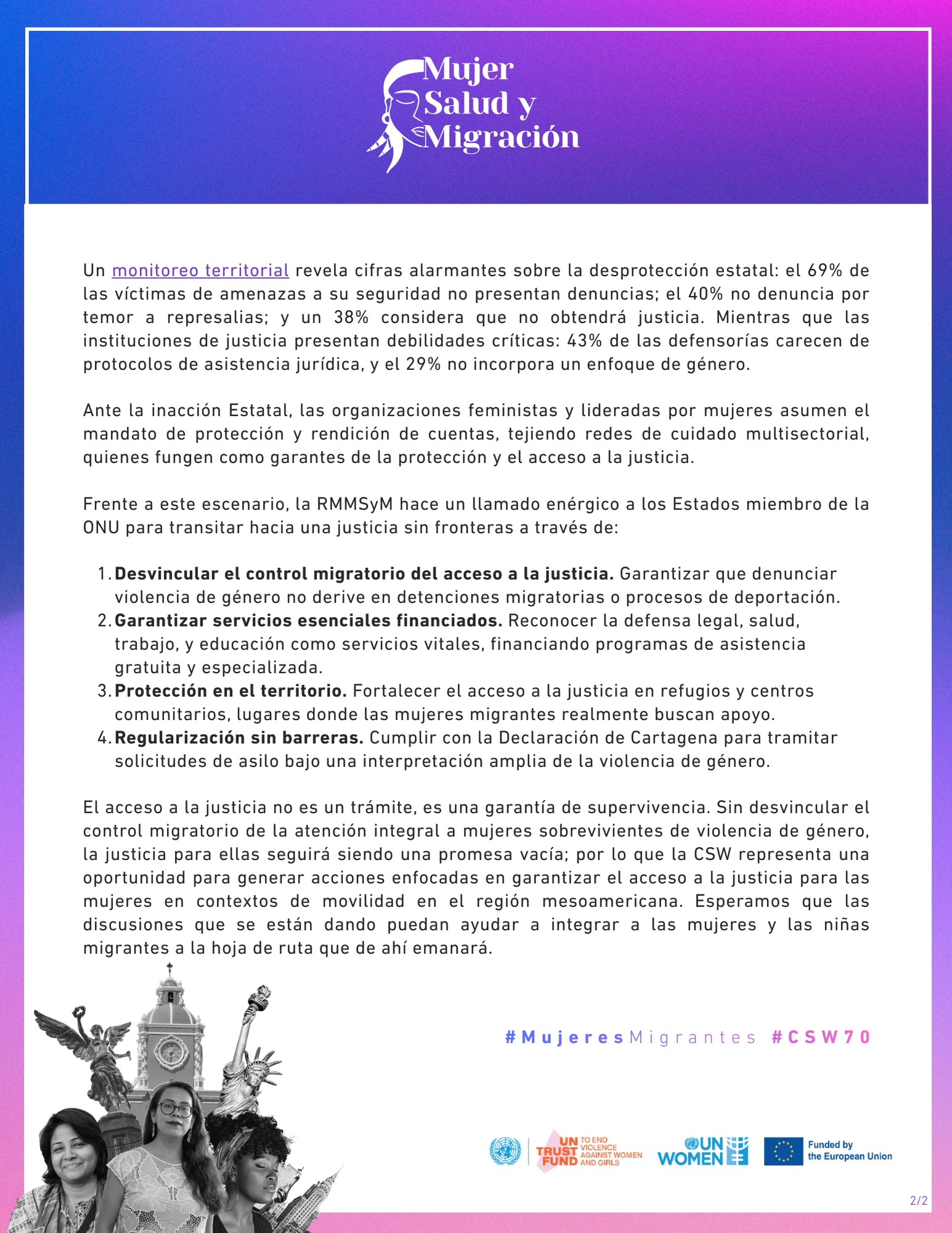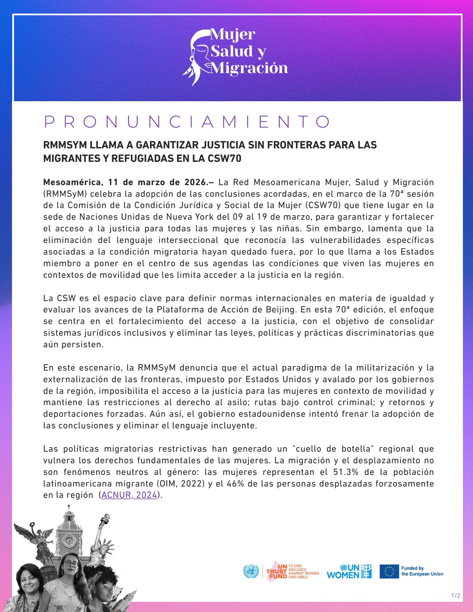 Durante la 70ª sesión de la Comisión de la Condición Jurídica y Social de la Mujer (CSW70), la Red Mesoamericana Mujer, Salud y Migración (RMMSyM) se pronunció para denunciar las persistentes barreras que enfrentan las mujeres migrantes y refugiadas para acceder a la justicia en la región.