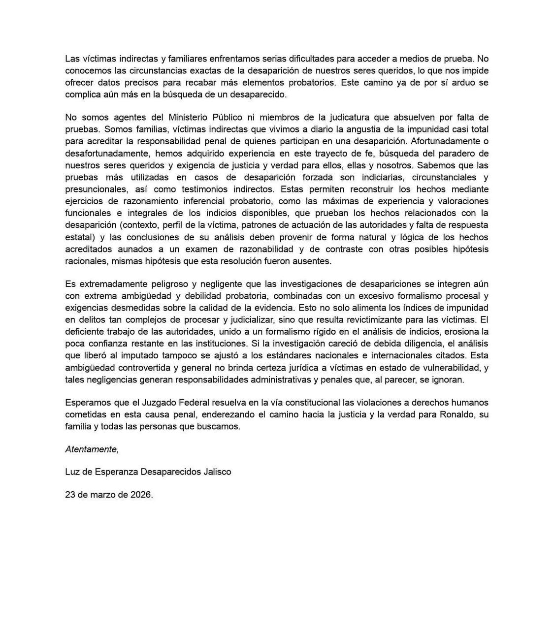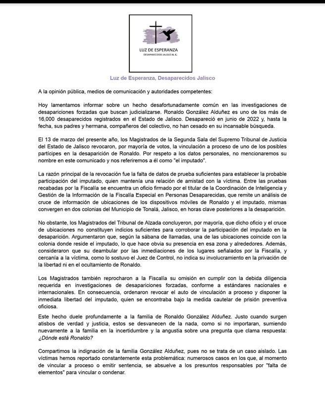 Casi dos años después, cuando parecía que la investigación comenzaba a sostenerse en tribunales, volvió a romperse. El 23 de marzo de 2026, el colectivo Luz de Esperanza Desaparecidos Jalisco informó que la Segunda Sala del Supremo Tribunal de Justicia del Estado revocó la vinculación a proceso de uno de los principales sospechosos en la desaparición de Ronaldo.