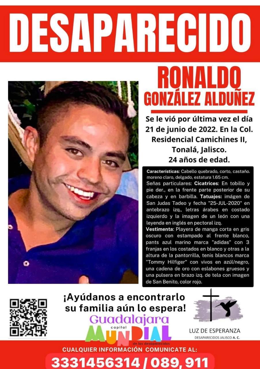Ronaldo González Alduñez fue desaparecido el 21 de junio de 2022 en la colonia Camichines II, en el municipio de Tonalá, Jalisco. Desde ese día, su familia, su madre, su padre y su hermana Fabiola no han dejado de buscarlo.