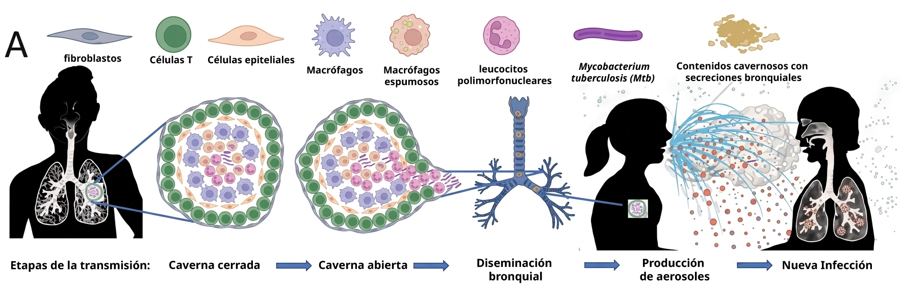 ¿Por qué son relevantes estas fases? Intentaré describirlo a continuación. La fase de “caverna cerrada” representa una donde suele haber un equilibrio entre la bacteria y el sistema inmune, en donde ninguna de las partes vence a la otra y, no se presenta enfermedad aparente pero tampoco se elimina al patógeno. La fase de “diseminación bronquial” representa la pérdida de dicho equilibrio y ya hay enfermedad manifiesta, permitiendo que la bacteria pueda acercarse y/o alojarse en vías aéreas. Finalmente, en la fase de “producción de aerosoles”, la bacteria que ya ganó acceso a vías aéreas, y a consecuencia de la respiración regular o tos de grado variable, logra salir expulsada al exterior y estar suspendida en partículas que luego podrían infectar a otras personas, regularmente en contacto cercano, hablando de espacio físico en un momento determinado.