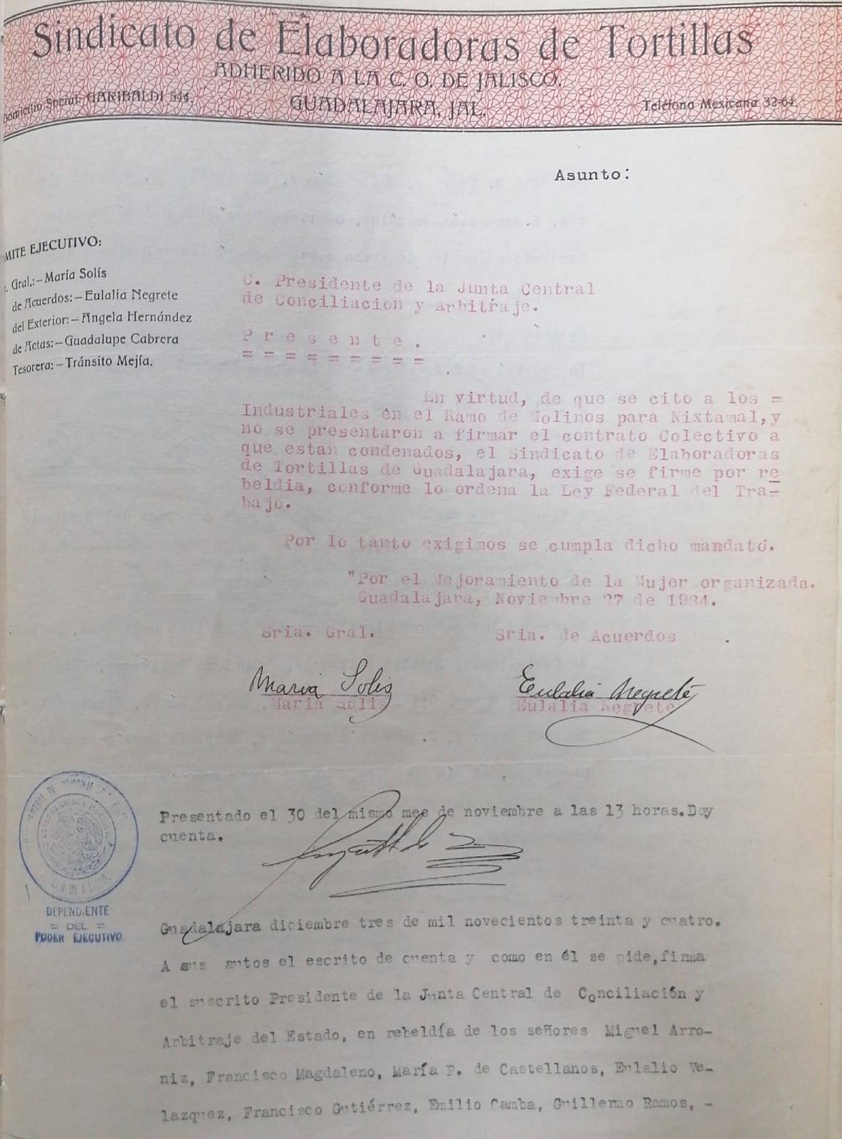 La primera huella de su lucha en el archivo digitalizado para esta historia es del 15 de mayo de 1934. Angela Hernández, secretaria general del Sindicato de elaboradoras de tortillas de Guadalajara, redactó un documento con esa fecha dirigido al presidente de la Junta Central de Conciliación y Arbitraje en el que demanda a 11 dueños de tortillerías para que firmen un contrato colectivo y solicita una fecha para una audiencia entre empleadores y la agrupación. En un segundo documento casi idéntico demanda a tres dueños de tortillerías más el 19 de mayo.