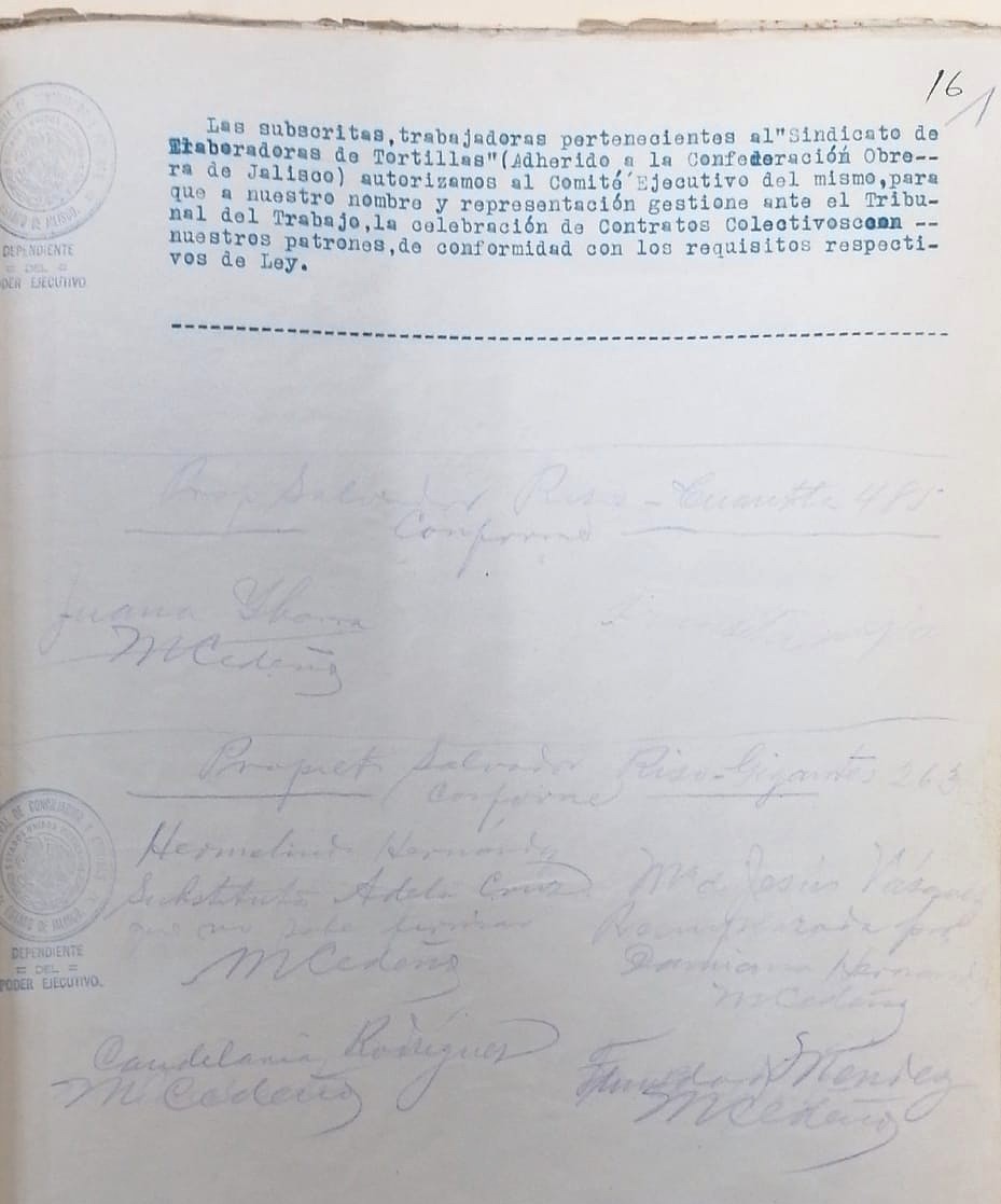 Parte de su historia se encuentra en una caja del Archivo General del Estado de Jalisco. En ella se resguarda una carpeta con actas de sesiones del sindicato, demandas formales, informes sobre el costo del maíz y elaboración de tortillas, el contrato colectivo donde las tortilleras exigen sus derechos y sus firmas certificadas. Algunos folios están en buenas condiciones y se pueden leer a la perfección y otros han perdido color y nitidez por los años. Este es un esfuerzo por recuperar su historia.