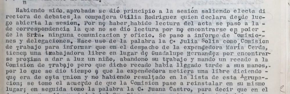 El tema de la maternidad también está presente en un acta de sesión del sindicato. El 23 de marzo de 1934, las tortilleras tuvieron una reunión nocturna en la que discutieron que una expendedora contrató a una trabajadora que no pertenecía al sindicato en lugar de Guadalupe Hernández, quien tuvo que dejar su trabajo por estar cerca de parir. Las sindicalistas acordaron solicitar su reinstalación en el empleo. Así, en pequeños gestos también se refleja una lucha laboral en defensa de las madres.