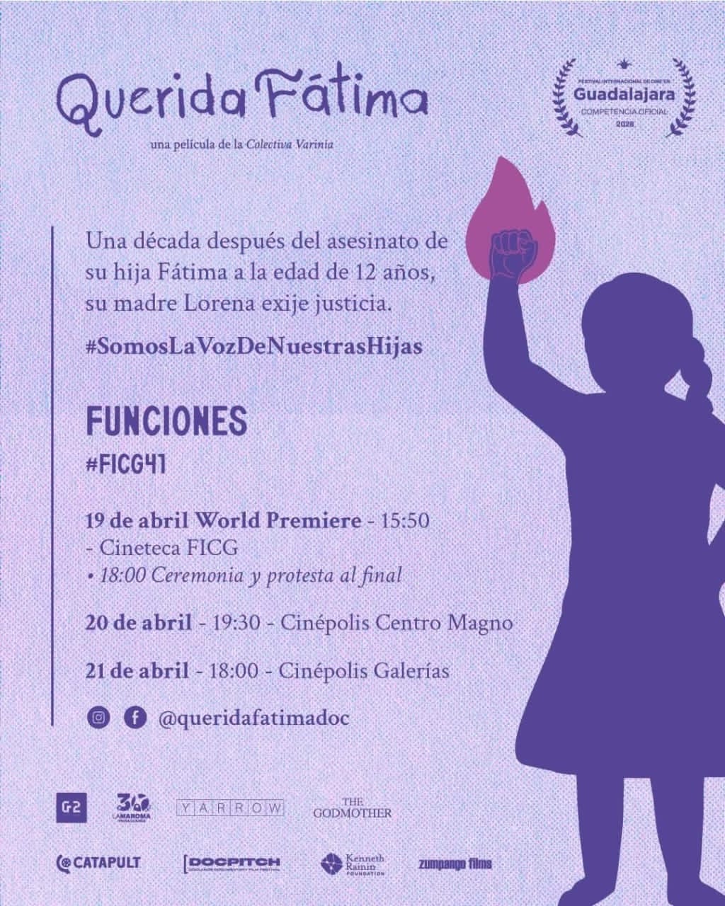 Ante la falta de respuesta institucional, el Frente Feminista de Jalisco convocó a una colecta sorora en especie para este domingo 19 de abril, a partir de las 14:30 horas, durante la premiere del documental Querida Fátima —una película de la Colectiva Varinia en competencia oficial del Festival Internacional de Cine en Guadalajara (FICG41)— en la Cineteca FICG. Los productos solicitados son despensa, artículos de higiene y alimentos no perecederos, y serán destinados directamente a las familias afectadas. Quien no pueda asistir puede solicitar datos para apoyo económico a través de las redes del Frente.