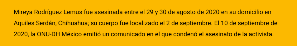 En la audiencia de individualización de sanción y reparación de daño (causa penal 170/2021) por el asesinato de Mireya Rodríguez Lemus, referente de la comunidad trans en el norte del país y cofundadora de la organización Unión de Fuerza y Mujeres Trans Chihuahuanses A.C., un Tribunal de Enjuiciamiento sentenció a 34 años y 6 meses de prisión para Iván Arturo G. P., por el homicidio agravado en razón de género y robo agravado.