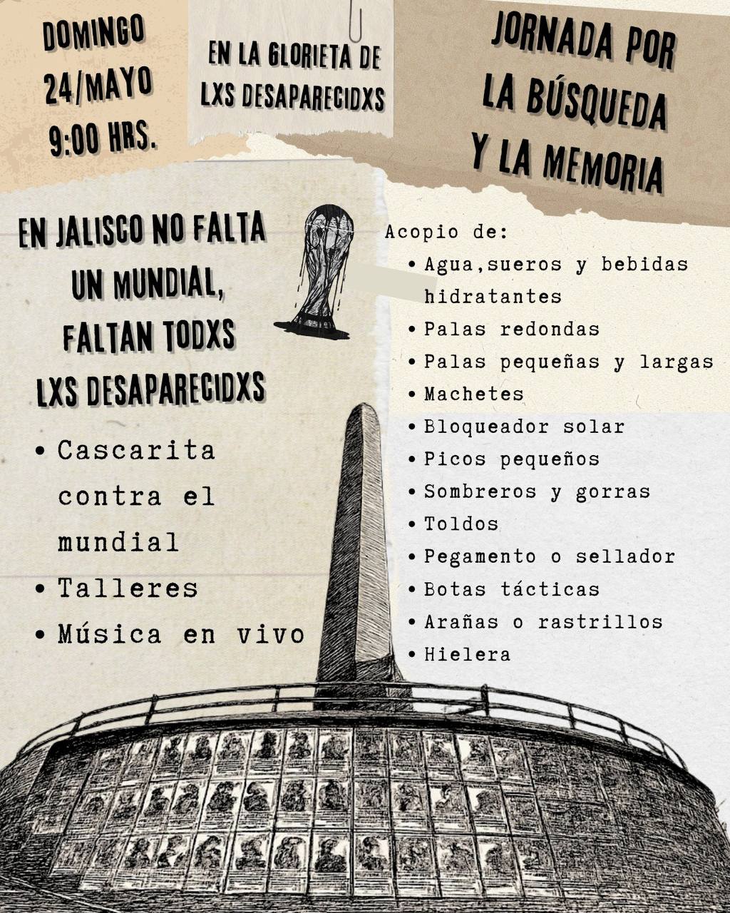 Para ello, la Red Contra la Desaparición Forzada en Jalisco organizó la Jornada por la Búsqueda y la Memoria con el objetivo de apoyarles a alcanzar su meta. El 24 de mayo, en la Glorieta de las y los Desaparecidos, se llevarán a cabo diversos talleres, música en vivo y una colecta de materiales necesarios como bloqueador solar, sueros, bebidas hidratantes, picos pequeños y botas tácticas, entre otros insumos.