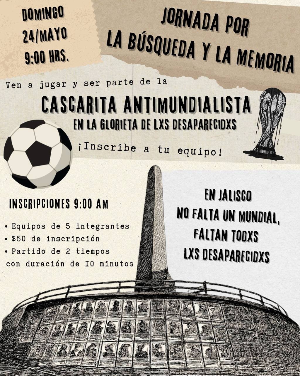Talleres, música en vivo y una “cascarita antimundialista” forman parte de la Jornada por la búsqueda y la memoria convocada por la Red Contra la Desaparición Forzada Jalisco, en apoyo al colectivo Guerreros Buscadores. La actividad se realizará el domingo 24 de mayo a las 9:00 horas en la Glorieta de las y los desaparecidos, un espacio que buscan cuidar y proteger ante el despojo.
